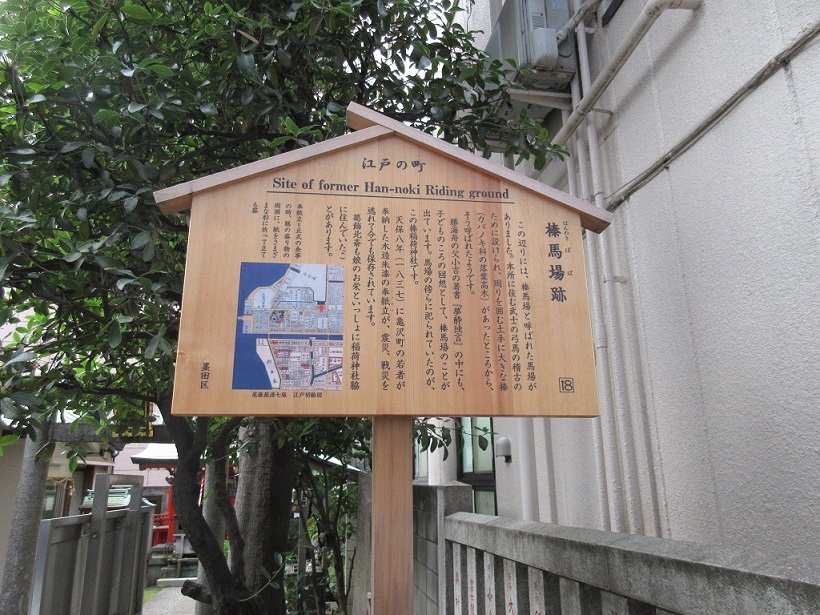 両国界隈を江戸の史跡を訪ねながら散策した際、清澄通りと京葉道路の交差点から北側に一本入ったところに榛稲荷神社があり、その境内にこのような説明板が立っていました。江戸時代には武士が流鏑馬の訓練にいそしんだ場所とのことで、平坦な場所であることがから大きな馬場の設置が可能だったのかと勝手に想像をめぐらしながら見学しました。