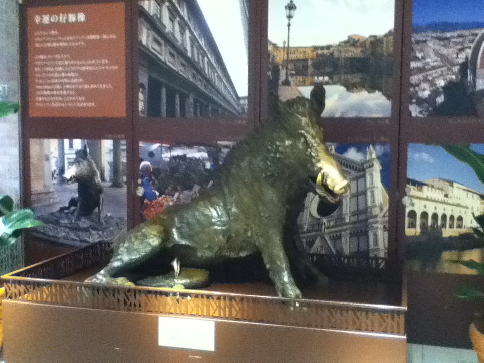 八重洲地下街の外堀地下1番通りの居酒屋、酔心の横の広場奥にこちらの像がある。週末、地下街は多くの人で賑わっていたが、こちらの像を見る人は他に居なかった。お勧めの点は、ポルチェリーノはイタリア・フィレンツェにあるウフィツィ美術館にある大理石像の復刻であること、幸運の仔豚像と呼ばれ鼻を撫でると幸運をもたらすといわれていること、顔付近は繊細に作られている立派であること、この像や説明板を見ながらフィレンツェの像を楽しく想像できること、駅から徒歩で行けることである。
