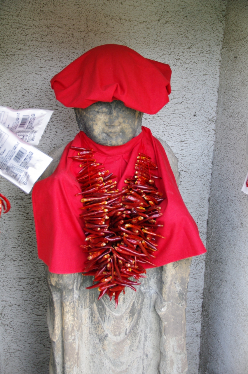 もう1つ小さなお堂が有り、こっちがユニーク。そこに咳止め地蔵尊が立っており、首にたくさんの唐辛子を纏っていました。こんな唐辛子を首に巻いたら、咳どころじゃなくなります。