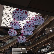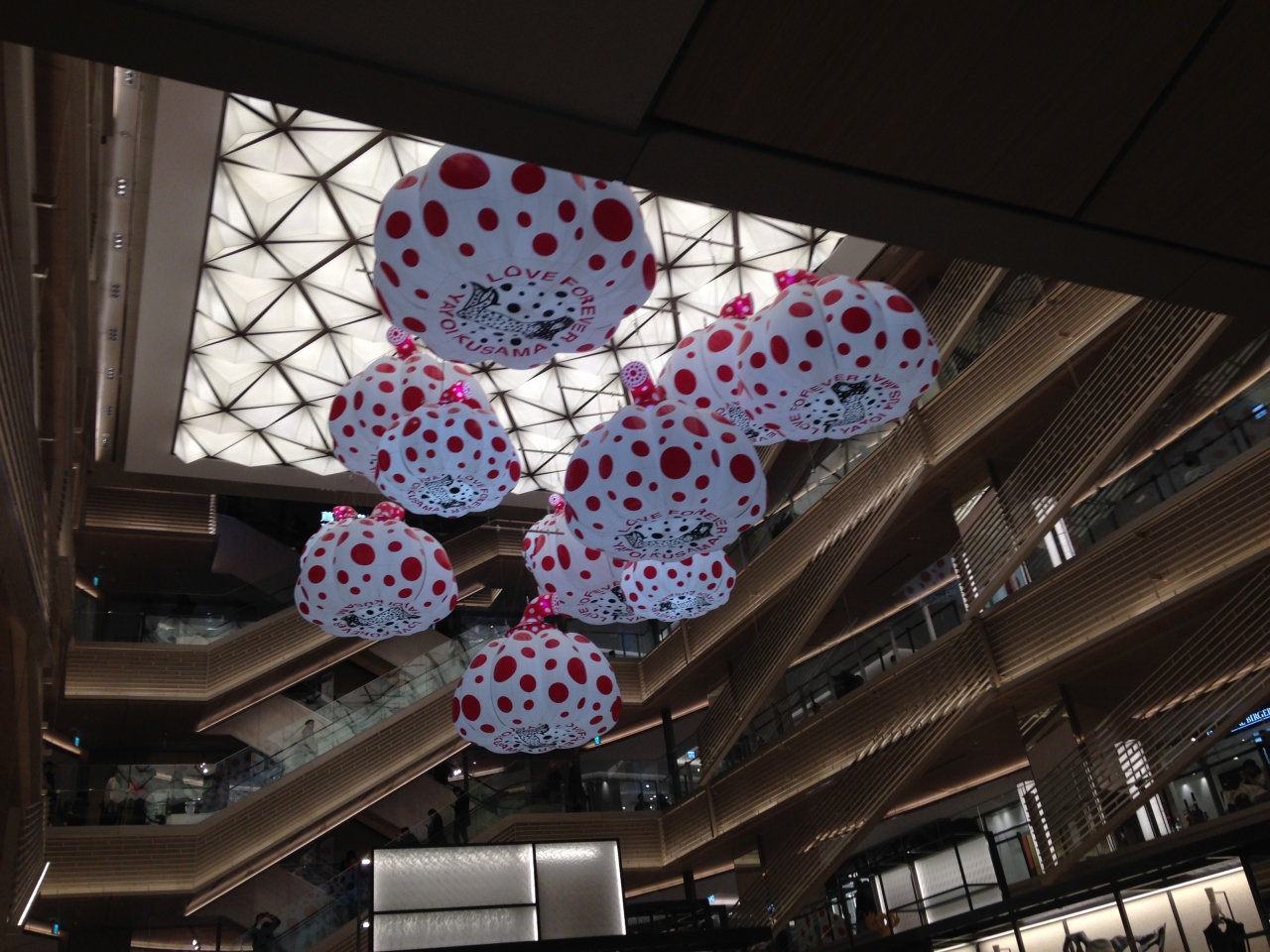 新しく、いかにも銀座といった高級ブランドが入っています。中央部分が天井まで吹き抜けになっていて、天井には草間和代さんの作品(ドット柄のかぼちゃ)がつるさがっています。上階にTUTAYAとSTARBUCKSがコラボしているエリアがあり、コーヒーを飲みながらゆっくりできました。