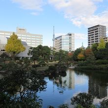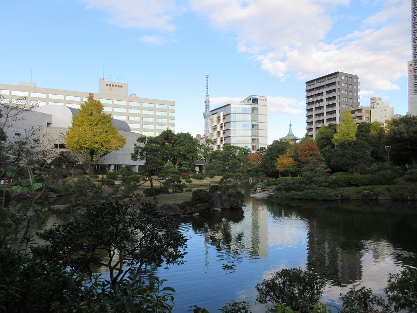 両国国技館から国技館通りを隅田川上流に向かうかたちで進むと、ほどなくして旧安田庭園に至ることが出来ました。入り口を入ると大きな池を中心に緑深い庭園が広がり、その先には横綱町公園の東京都慰霊堂の塔を望むことが出来ました。周囲に高いビルが少ないこともあり、ゆったりした開放感のある空間が広がっていました。