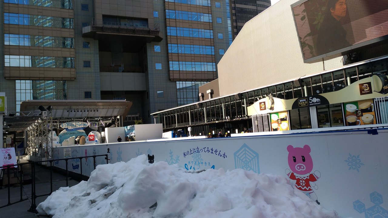 TBSの一階に入ると、TBSのキャラクターもたっています。今現在放映中の番組の紹介パネルがなかなか面白いですよ!冬場はイルミネーションやアイススケートリンクまであります。ちびっこたちもすべっていました。スケートできるなんて、都会ではかなり貴重な場所ですよね!