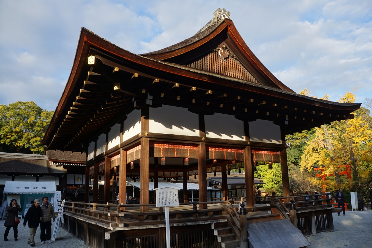 下鴨神社の舞殿は、楼門をくぐるとすぐ目の前。葵祭の際は、勅使がここで御祭文を奏上します。赤い縁の御簾がかかって、上品な色調。ぐるりの縁の低い欄干にちょっと反りのある屋根の形とか。この建物全体のバランスの良い美しさも見どころでしょう。
