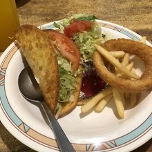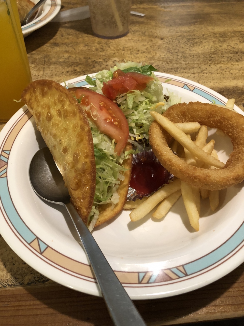 タコライスが食べたくて行ったのですが!なんとタコス、タコライス、オニオンフライ、フレンチフライが付いたセットが650円でとてもお得だったので初タコスを頂きました。辛いソースはお好みだったので辛いのが苦手な私も美味しく頂けました。