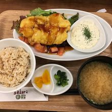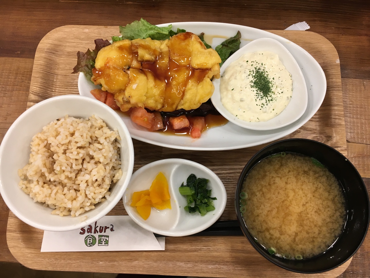 13:00ごろ行ったら2種類の焼き魚セットが終わってたので鶏むね肉南蛮焼きランチ頼みました。万能茶という体に良さそうなお茶はサービスでお代わり自由です。店内は北欧調の明るいカフェのような造り。玄米とお味噌汁と鳥のむね肉でヘルシーで美味しかったです。