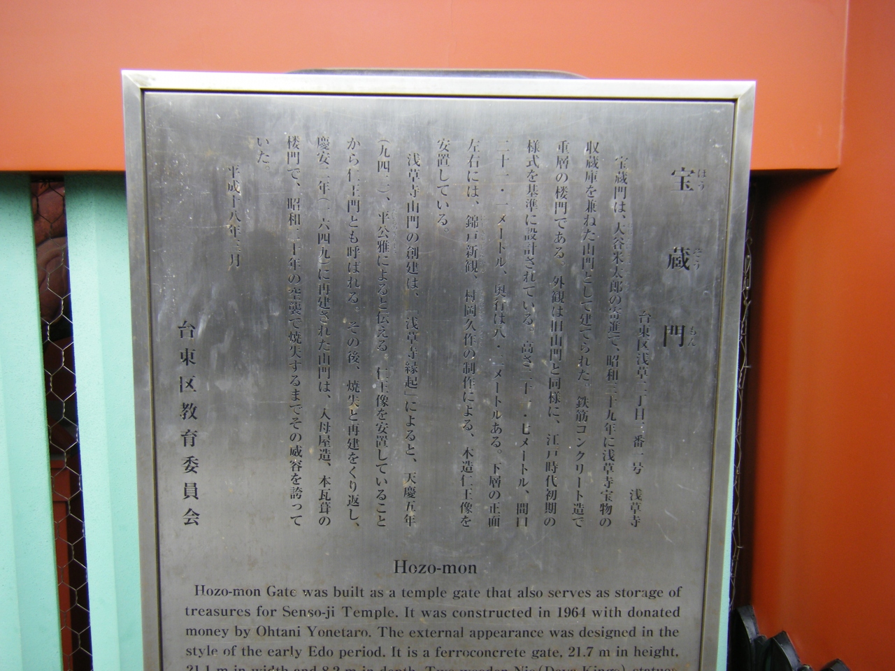 浅草寺の雷門を過ぎて、仲見世通りをまっすぐ進むと大きな山門にたどり着きます。宝蔵門は942年に平公雅によって創建され、仁王像を安置していた事から創建された当初から仁王門と呼ばれていたそうです。その後災害による焼失と再建を繰り返しながら、1945年に空襲で焼失すると、その後昭和39年に現在の位置に宝物庫を兼ねて再建され以来、宝蔵門と呼ばれるようになったそうです。雷門も見ごたえ十分ですが、2つめの山門である宝蔵門もとても大きく圧倒されました。見ごたえ十分の山門です。