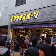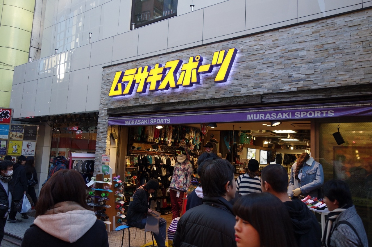 渋谷スペイン坂にあるムラサキスポーツの店舗です。他店に比べて売り場の規模は大きくありませんが、それでもヨコノリが得意なショップだけあって、スポーツ系のカジュアルも多く他のスポーツショップとは一味違う品揃えの魅力が有りました。