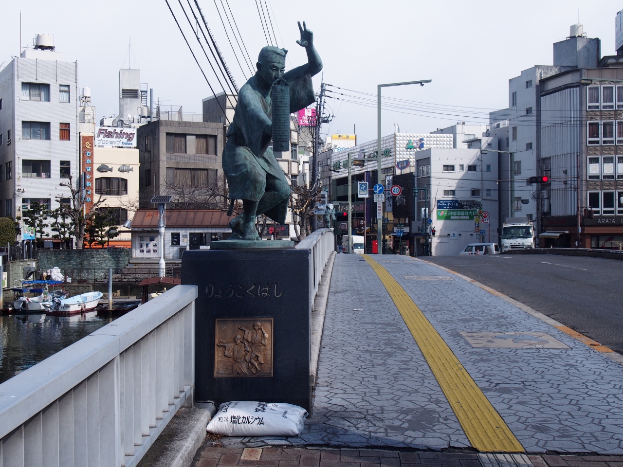 両国橋は新町川に架かる橋で、上流側には新町橋、ふれあい橋などがあります。両国橋は街の中心にかかる橋なので、人の往来も多いですし、車の交通量も多いです。また橋の欄干には阿波踊り姿の像があるのが、橋の歩道を歩いていても目を楽しませてくれます。