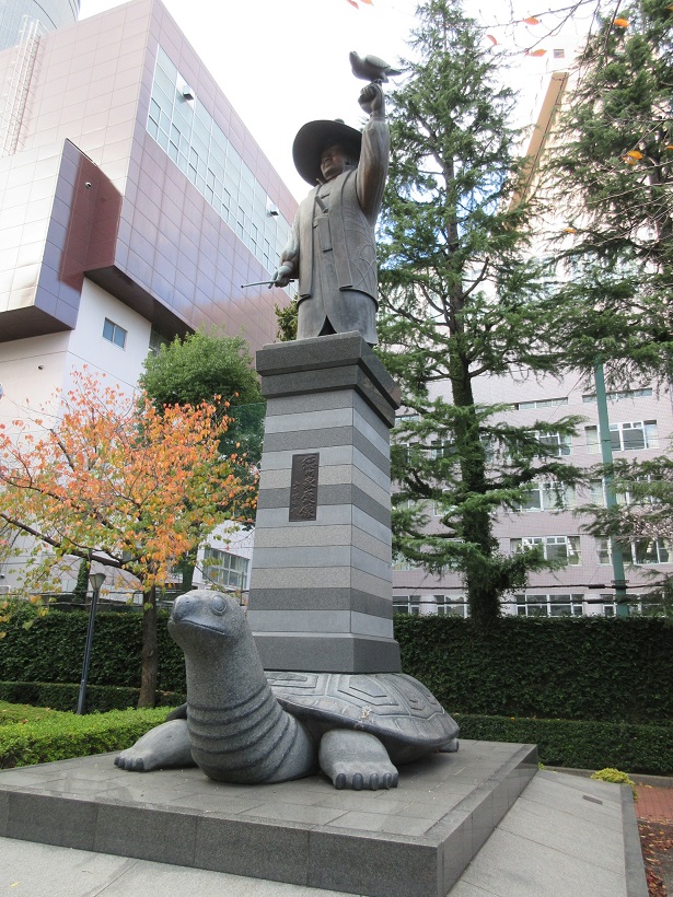 両国界隈を散策し、江戸東京博物館裏の日本大学第一中学校の脇道緑地の中に徳川家康の像がありました。台座の上に立っているのであれば、良く見かける像とさして変わらないですが、こちらはその台座が亀に載っているというもの。誰が考えたのか変わったデザインです。家康像ではなく碑文が刻まれた石板であれば、それが亀の甲羅に乗っていても大陸ではしばしば見かけるデザインと同じで違和感は無いのですが・・・。安定感に欠け今にも倒れてしまいそうな不思議な像でした。