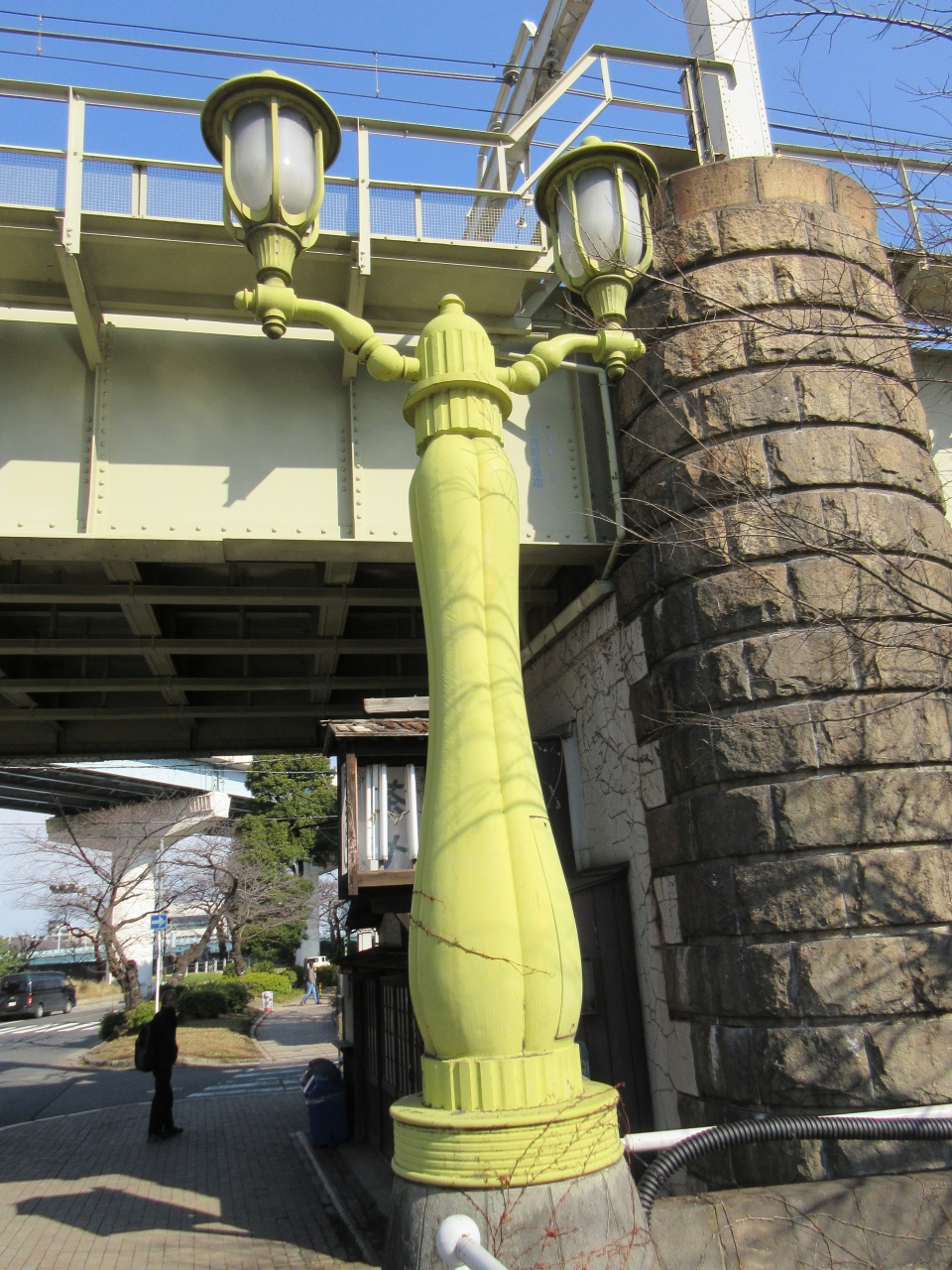 北十間川に架かる隅田川そばの橋です。元は源森橋と呼ばれ、現在の隅田公園にあった水戸藩屋敷に入る堀に架かる新小梅橋と並んでいたため二つの橋を合わせて枕橋と呼んでいました。堀が埋め立てられ、明治初期に枕橋と呼ばれるようになりました。この説明が現在の源森橋そばにある石碑に記されています。黄緑色の街灯と親柱の上の街灯の曲線がレトロな感じで印象的です。東武線高架下に閉店した古い茶屋があり、橋に雰囲気を加えています。