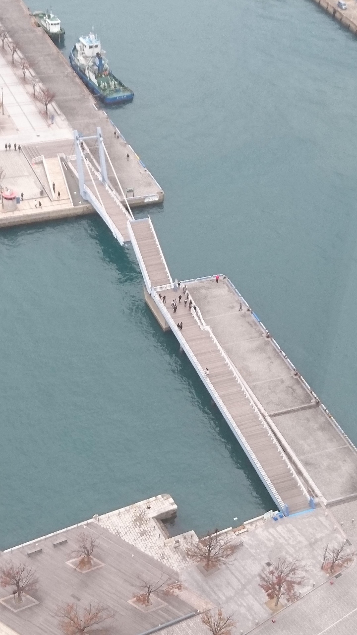 門司港に来たときに門司港レトロ展望室に行くためこの橋を利用しました。この橋は1日6回船の出入りのため橋が跳ね上がる歩行者専用の橋で橋が跳ね上がる看板もあります。門司港レトロ展望室からは橋が跳ね上げられていて、橋が下りて繋がる瞬間を見ることができました。