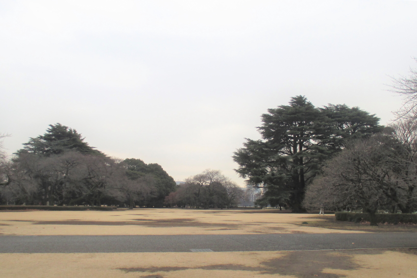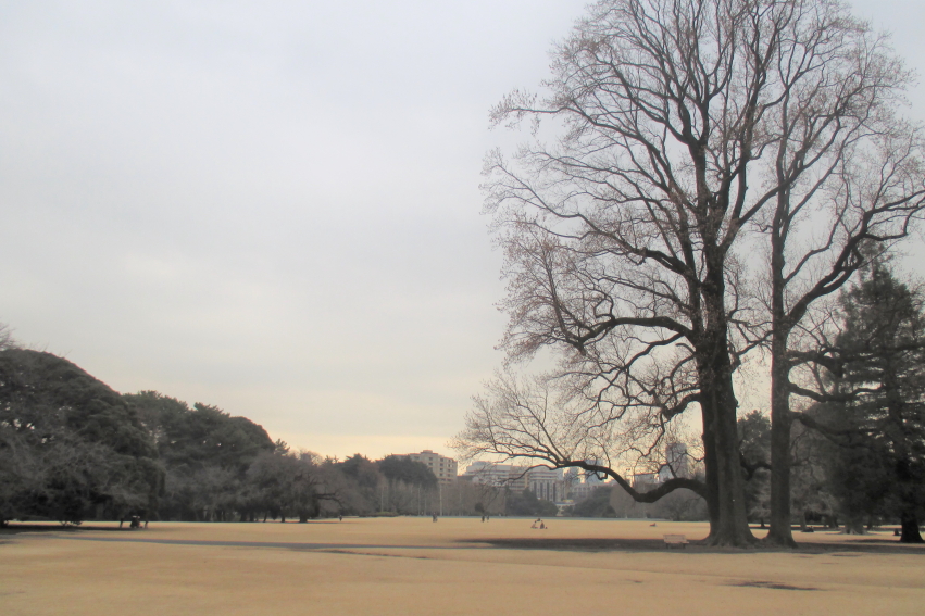 新宿御苑は巨木と呼ぶに相応しい木も多いですが、また、広々とした広場もたくさんあり、近隣のビルのスカイラインに邪魔されない、広々とした空を独り占めした様に感じることができます。今回訪れたのは花の季節でもない1月ですから、入園している人はずいぶんと少なかったのですが、それでも外人さんを含めて結構な人が入っていました。やはり人気の場所なのですね。