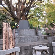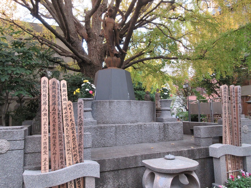 回向院のゲートをくぐり、力塚を過ぎてさらに進むと、左手にお墓のような台座に天女のような赤銅色の像が乗っている慰霊碑がありました。その右手に案内板あり、何のための像かわかるようになっていました。読んでみると振袖火事をして知られる江戸の街を焼き尽くした明暦の大火によって命を落とした10万人ともいわれる犠牲者を供養する碑であることが書かれていました。明暦の大火、関東大震災、東京大空襲とこの街が三度壊滅的被害を受け、その中から蘇って来たことを、静かな天女の微笑が静かに訴えているように感じました。