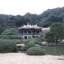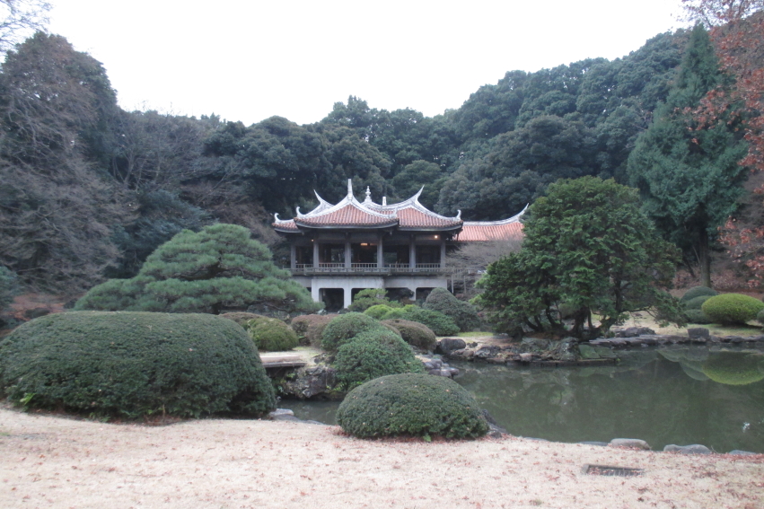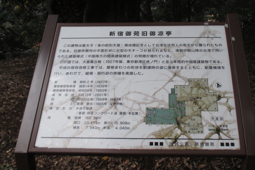 旧御涼亭は上の池と中の池とをつなぐ水路の一画にあります。外から眺めると後ろの深い森の中に包まれている様に見えます。案内板によれば、昭和天皇の御成婚を記念して、昭和2年(1927年)に、台湾在住邦人の有志の方々から寄贈されたのだそうです。そういえば、当時の台湾は日本が統治していた時代だったのですね。