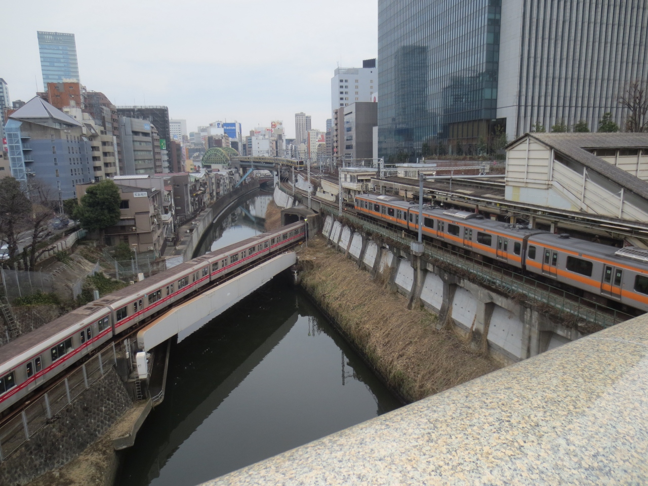 お茶の水駅駅前、外濠に架かった橋です。大きな通りになっていて、風情はほぼ皆無ですが、両側に歩道があり、石造りの柵がちょっと重厚な感じでした。神田駅側の歩道からは、中央線、総武線、そして東京メトロ丸の内線の3路線を眺めることが出来、タイミングが合えば、実際の車両を同時に見ることも可能です。橋を渡った先に「聖橋の由来」が明記された記念碑がありました。