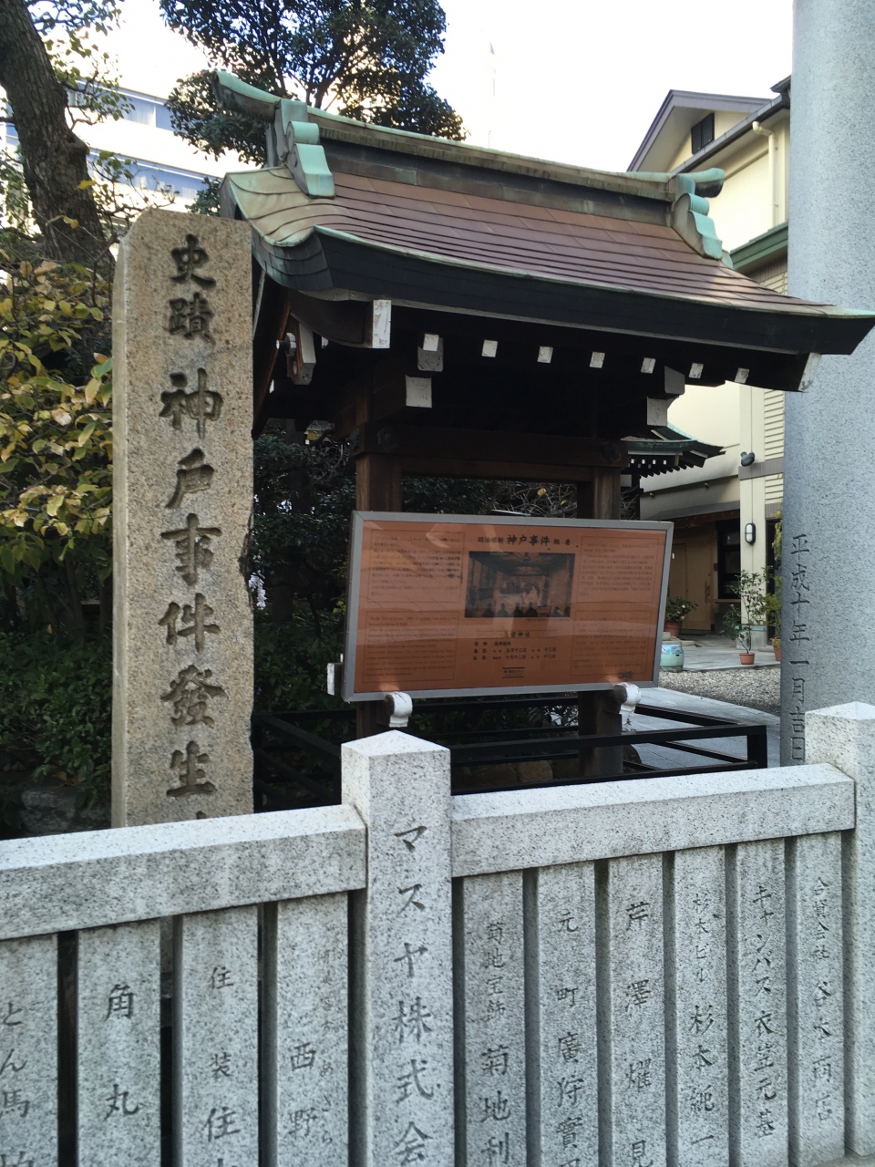 三宮の発祥の地にある神戸事件の碑。神戸事件といっても、分からない人も多いのか、きちんと説明のパネルがありました。日本の体外的な力がもっとあれば、切腹はなかったんじゃないかなどといろいろ考えさせられました。さほど大きな場所ではないので、見るだけであればすぐにおわります。