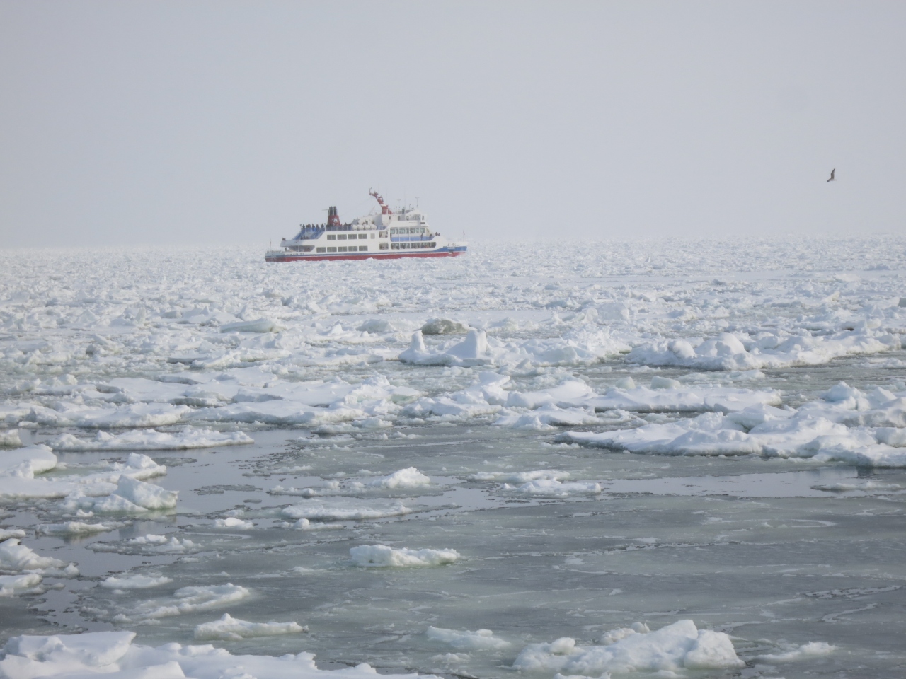 網走の流氷接岸初日発表から5日目に訪問しました。港外へ出ると沖まで一面見渡す限り流氷に覆われた白銀の世界が広がっていました。厚さが30~40センチ以上あるかなり大きな流氷も多く、船が流氷を押し割っりながら進む(まさに砕氷船の様に)のは初めての体験でした。