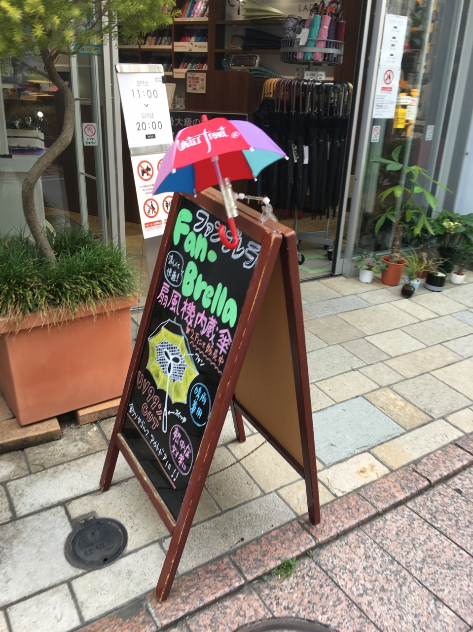 自由が丘の緑ヶ丘駅側の踏み切りに沿って建てられている傘専門店です。この日はお天気が良かったですがお客さんで賑わっていました。日傘、雨傘、折り畳み傘、和服用の傘までたくさんの種類の傘が揃っていました。入り口にある看板の扇風機付き傘がとても気になり入りました。誰かにプレゼントしたいです。