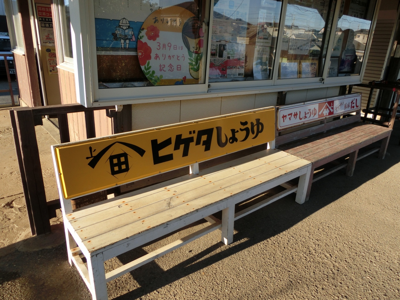 駅になるベンチは銚子を代表する企業「ヒゲタ醤油」と「ヤマサ醤油」の広告が付いたものが仲良く並んでいます。