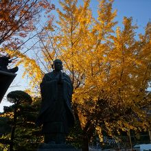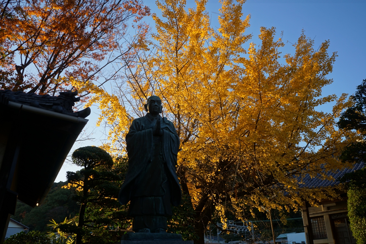 理源寺は、興津市街にいくつかある寺の一つ。日蓮宗の寺です。旧東海道からちょっとした参道があって、正面に山門。境内には日蓮上人の銅像が建っていますが、その辺りがイチョウなどの紅葉スポット。夕日に照らされて、いい眺めになっていました。穏やかな雰囲気のあるお寺です。