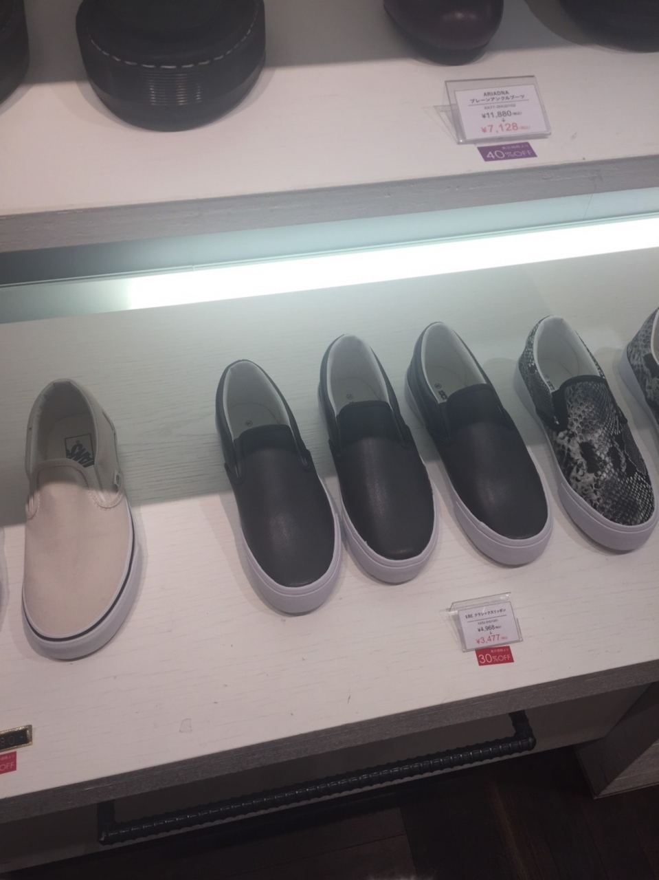 お店の前を前を通りかかるとセールしているようだったので入ってみました。2点買うとさらに10%オフと言うお得なキャンペーン中でした。普段履けそうなスニーカーが安くなっていたので購入しました。着回しが効きそうな服が沢山あり、またお買い物しに行きたいと思います。