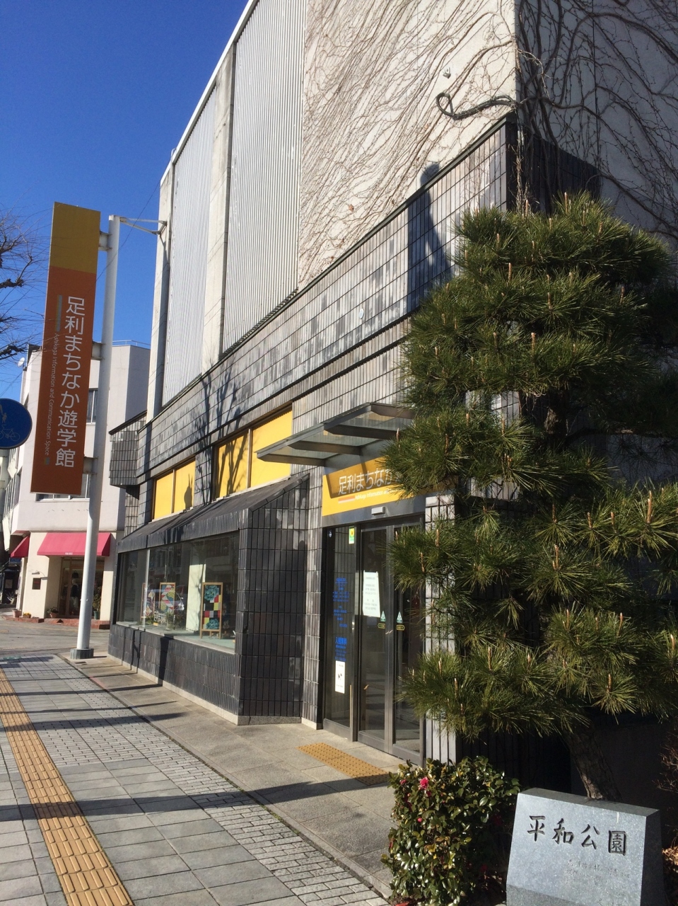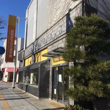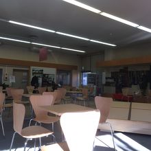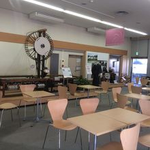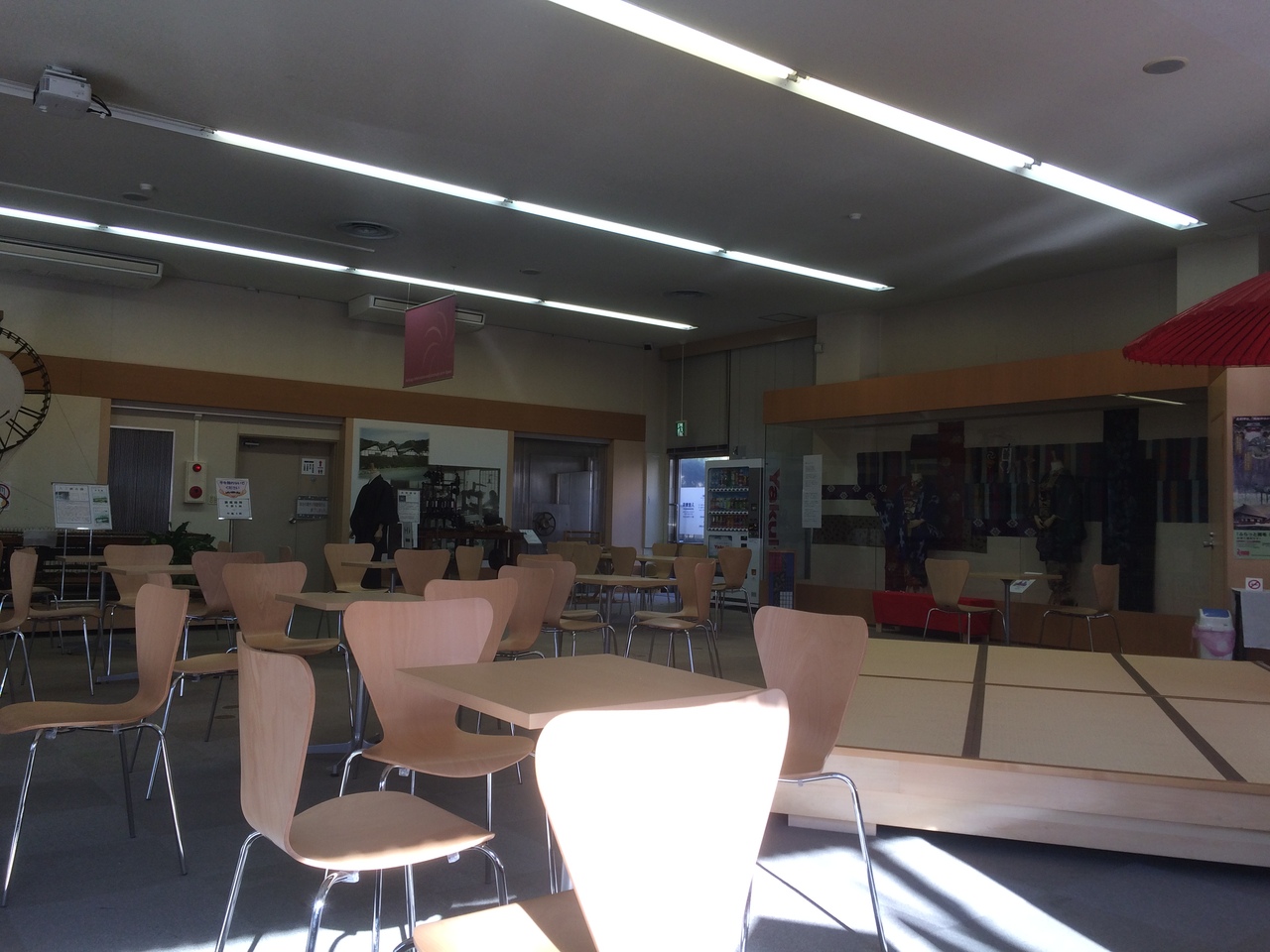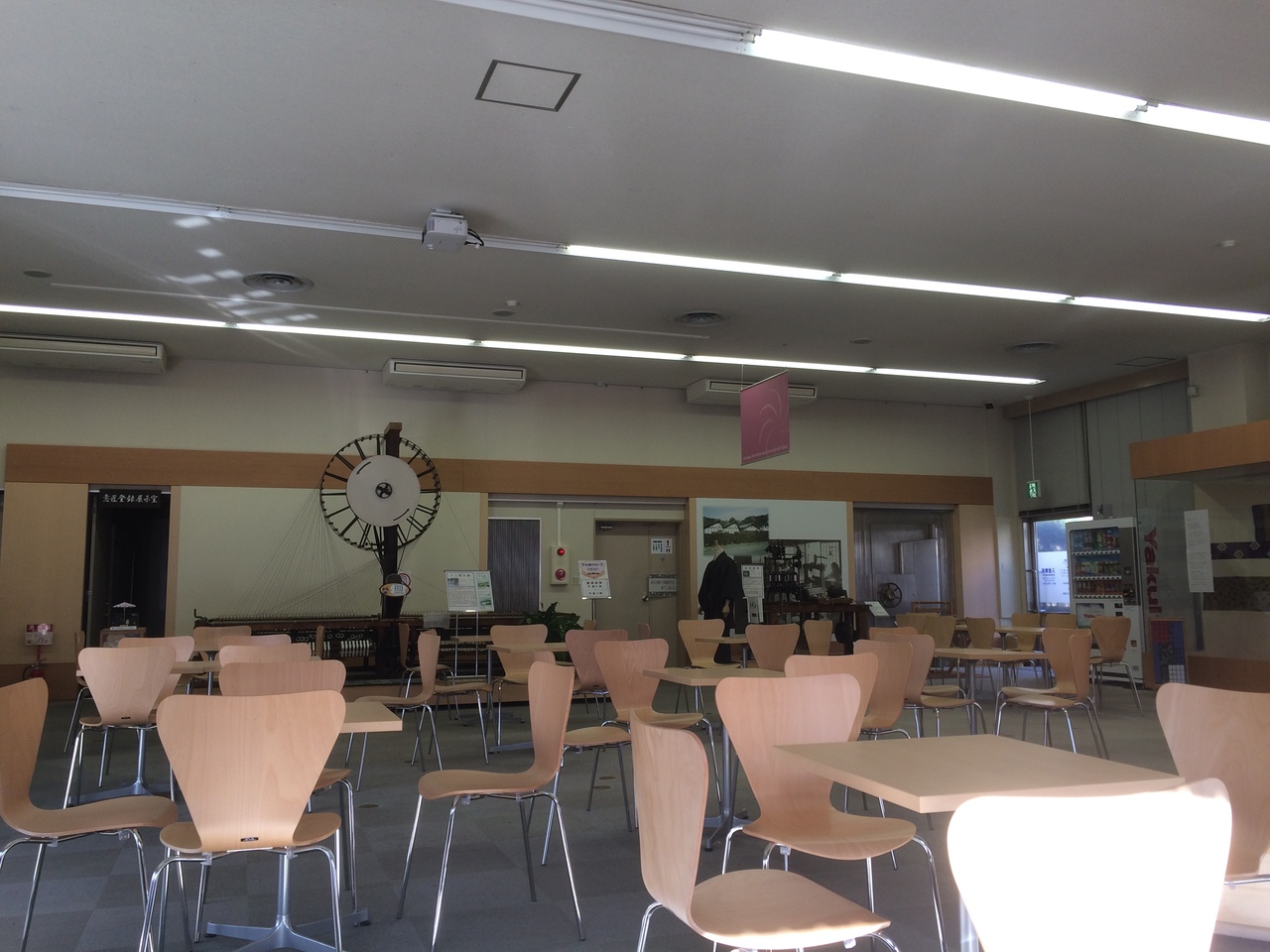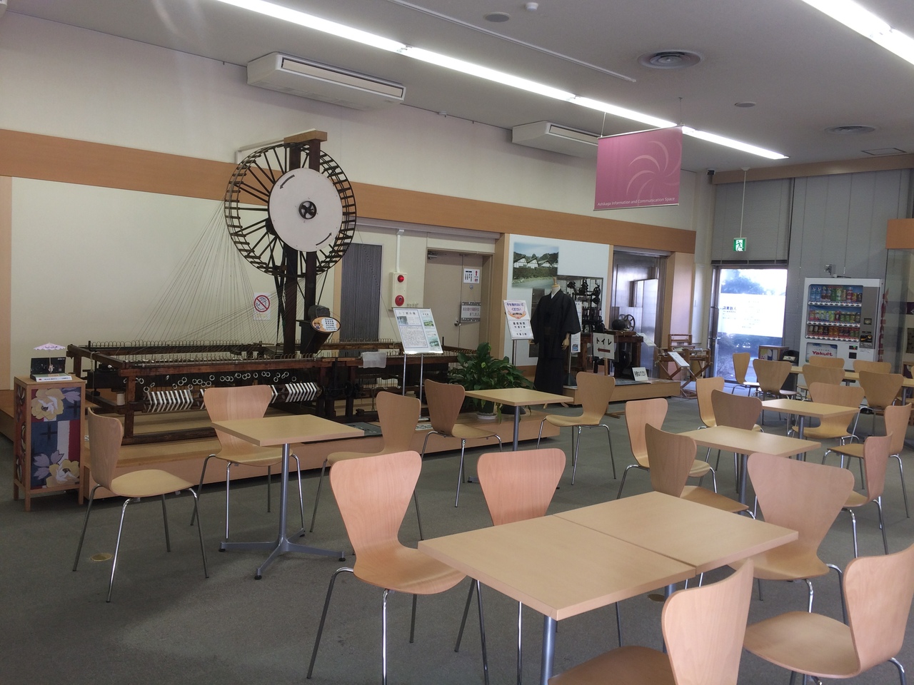 中に入ると中央にたくさんの椅子が並べられ、無料で休むことが出来ます。畳も置いてありました。飲み物の自動販売機もありました。奥には織物のような品や和服が飾ってありました。建物や看板は銀行のような雰囲気でした。