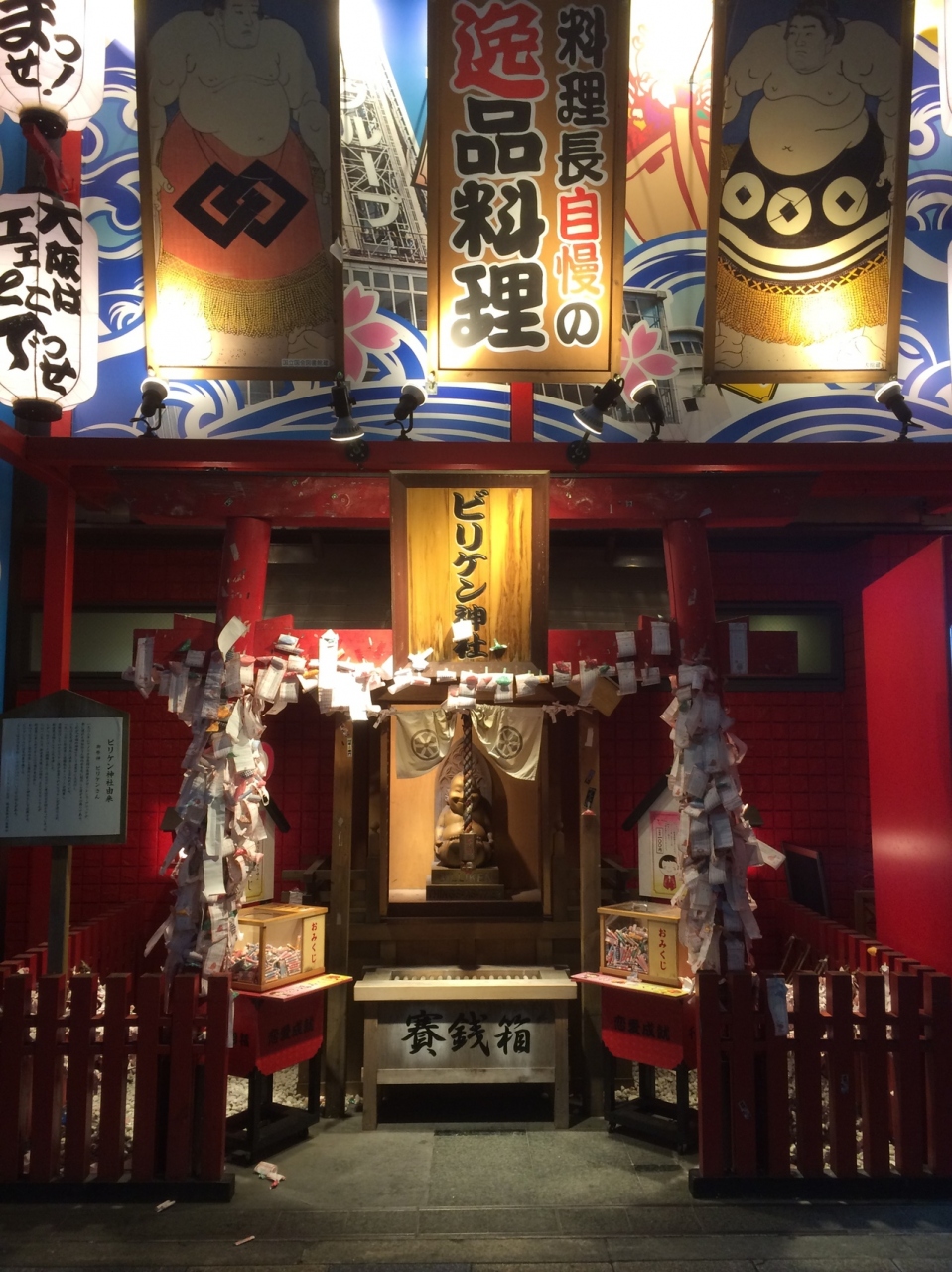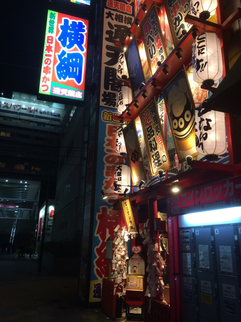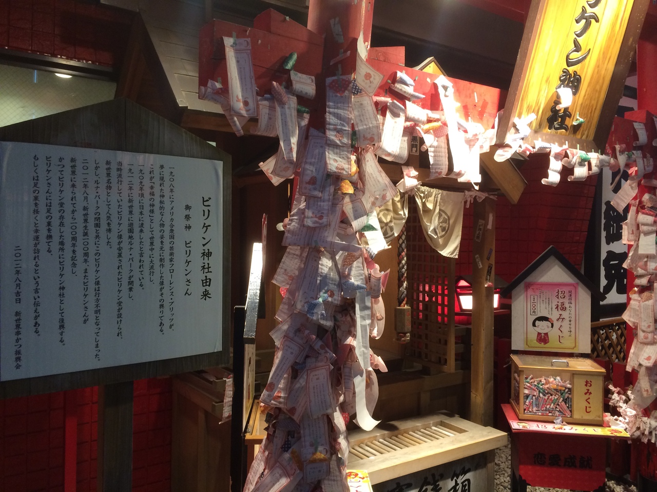 通天閣の写真を撮っていると横に派手な看板があり、下には小さな神社がありました。賽銭箱の左右には、おみくじ箱があり、たくさんのおみくじが巻いてありました。周りのネオンもあるので常に明るい神社ですが周りが派手な建物が多いため見逃してしまう神社でした。