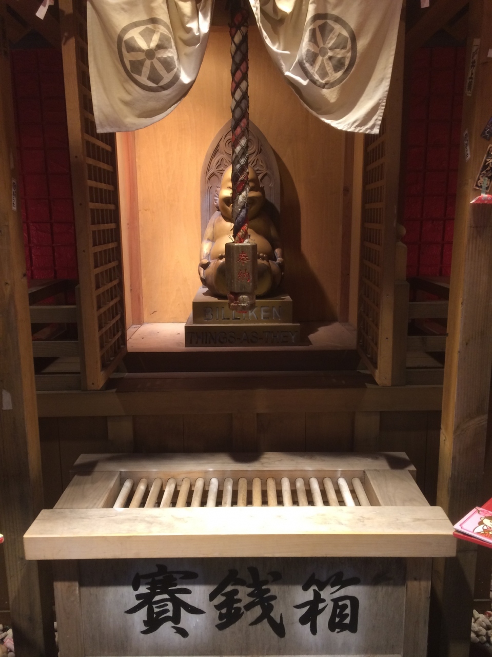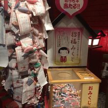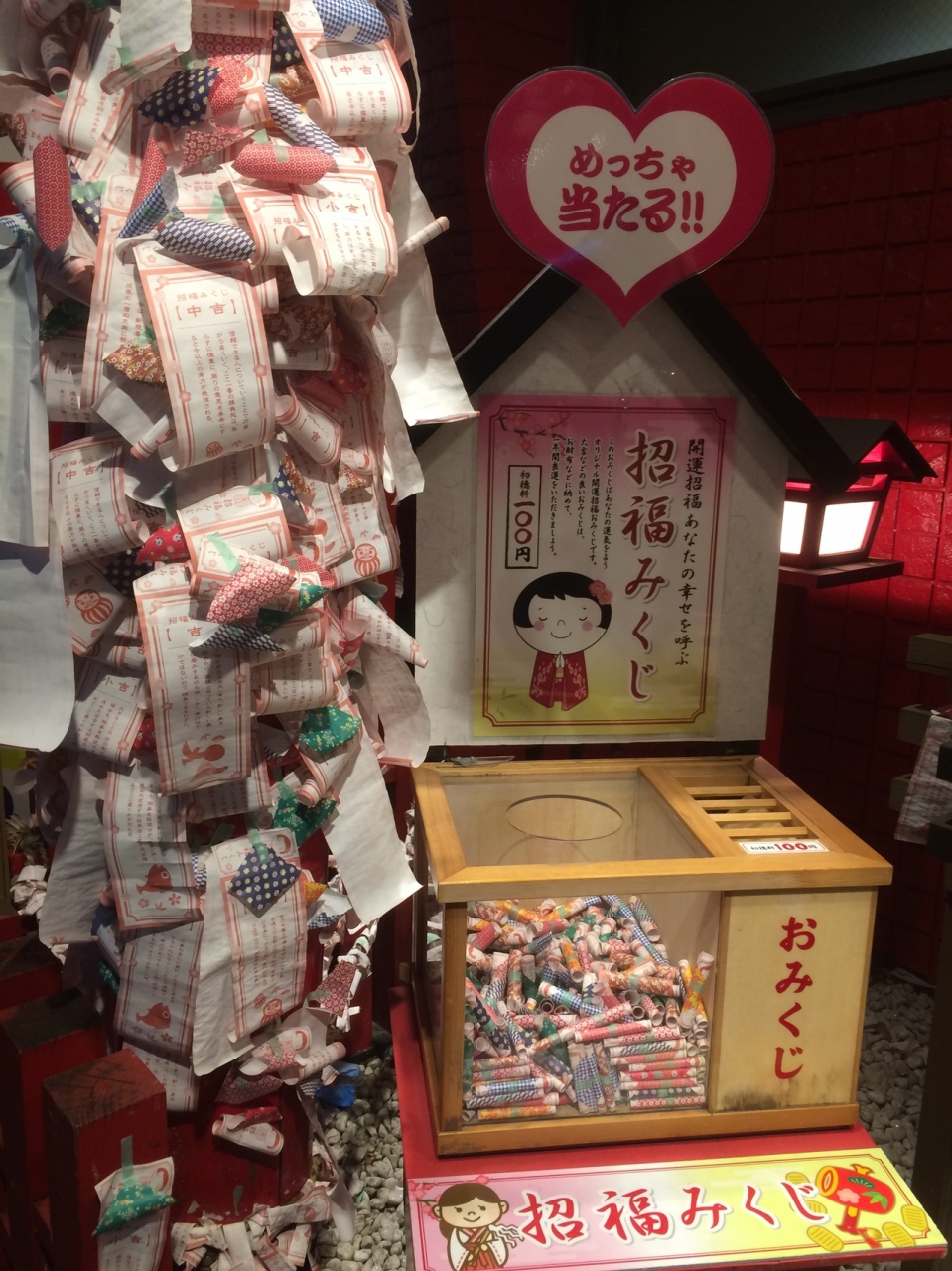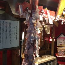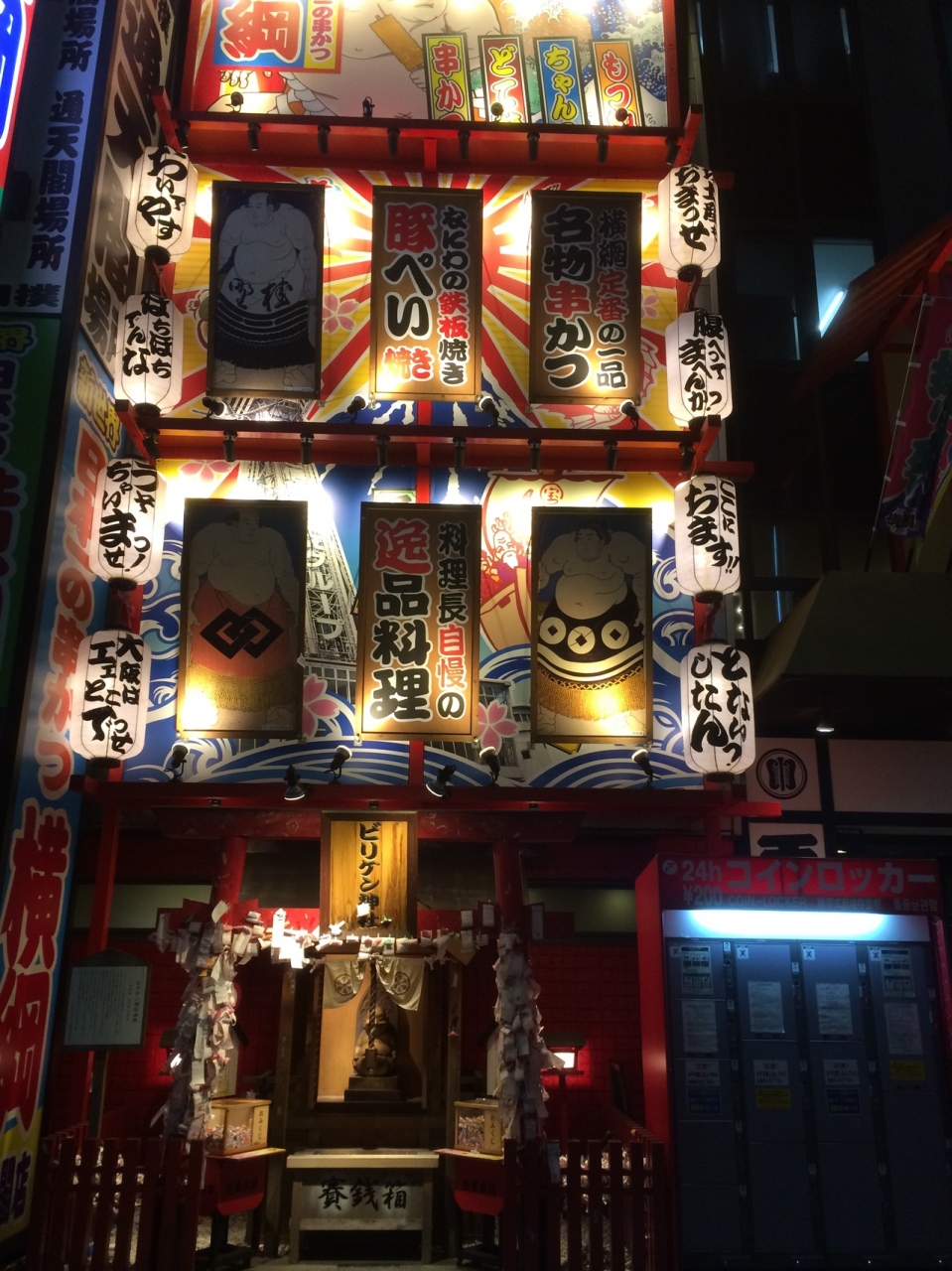 通天閣の写真を撮っていると横に派手な看板があり、下には小さな神社がありました。賽銭箱の左右には、おみくじ箱があり、たくさんのおみくじが巻いてありました。周りのネオンもあるので常に明るい神社ですが周りが派手な建物が多いため見逃してしまう神社でした。