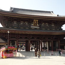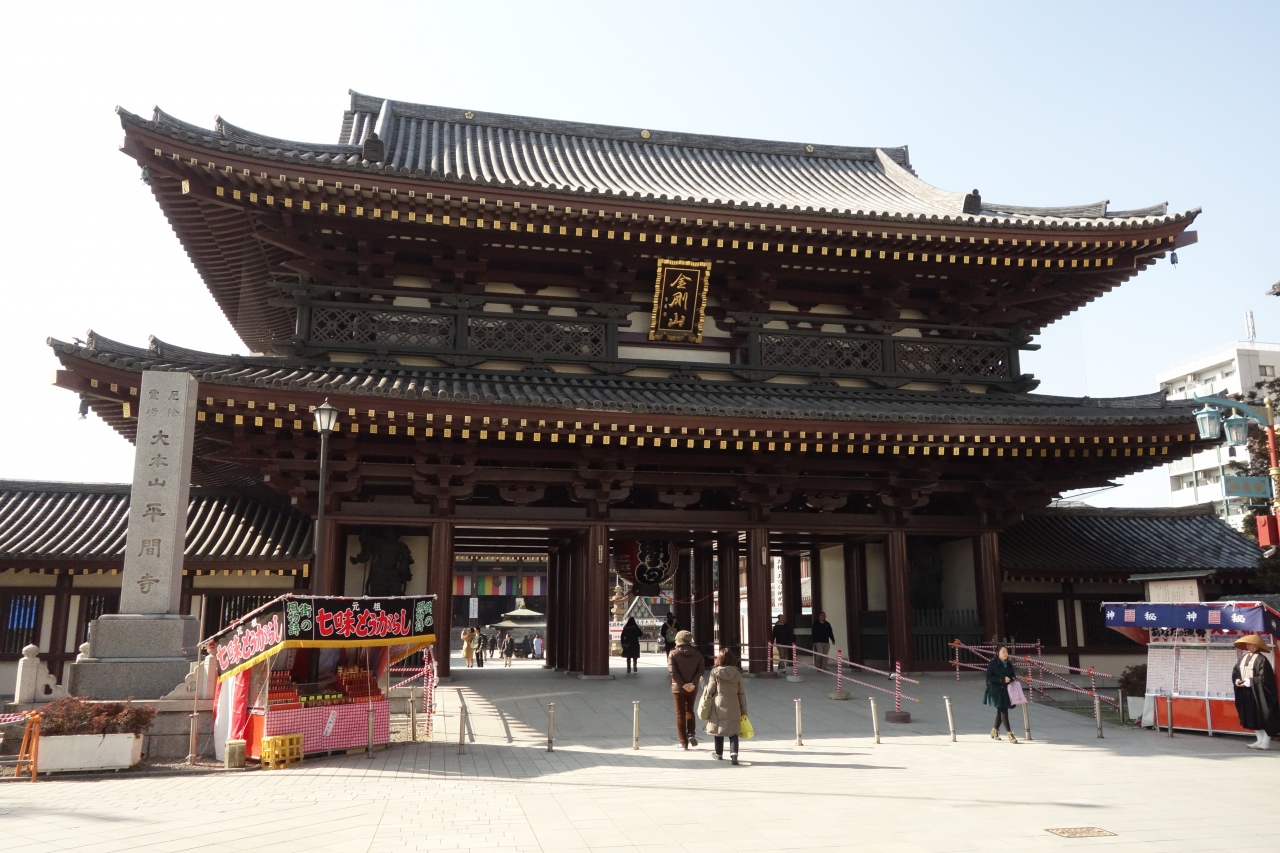 仲見世から川崎大師に向かうと、最初に見えてくるのがこの大山門です。威圧的なほど立派な門となっています。怖い顔をした四天王像が安置されていますが、これは京都東寺の四天王像を模造したものだとか。道理で迫力があります。悪い人はここから先には入れないのです。