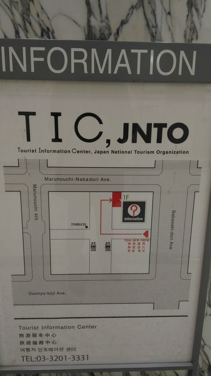 丸の内、三菱一号美術館の向かいにある新東京ビルの一階、皇居側出口の近くにある、日本政府観光局(JNTO)が運営するツーリスト・インフォメーション・センターです。1月1日を除て開館されていて、日本を訪れる外国人旅行者に日本全国の観光情報を提供されているとのことでした。