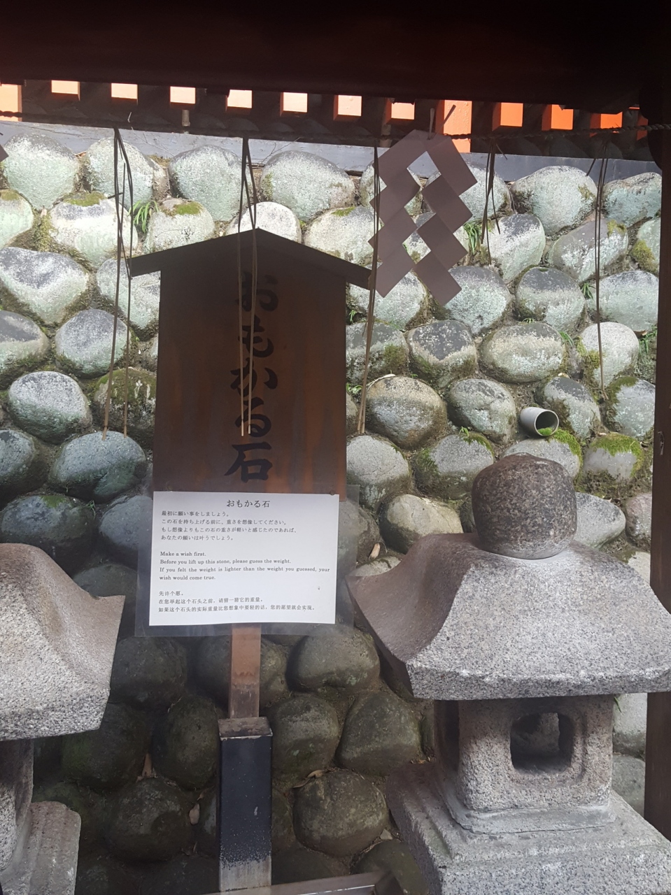伏見稲荷大社にあります!少し登った所にあります。石は確か2つありました。お願い事をしてから石を持ち上げます。石が軽かったらお願い事が叶えられるそうです。ほとんどの方が「重っ!」って呟いていました。女性だとかなり重いと思います。