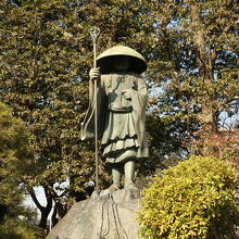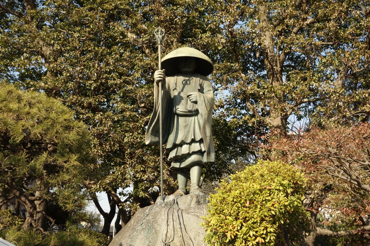 川崎大師の境内、八角五重塔の近くに立つ弘法大師様(空海)の像です。お遍路にあった時の姿を再現しています。杖と笠を纏った勇ましい姿であられます。