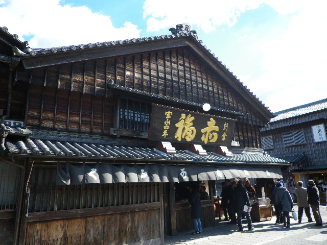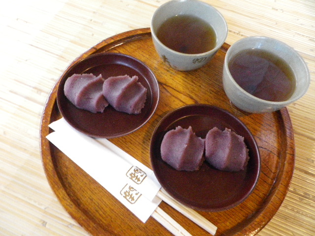 食券売り場で赤福餅2個とほうじ茶付き210円を購入。番号札を貰い30名ほど座れる店内か五十鈴川沿いの店外の席が選べます。空いている店内テーブルで5分ほど待つとお盆に乗せて運んでくれました赤福餅を美味しく頂きました。