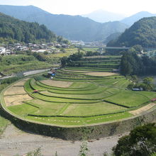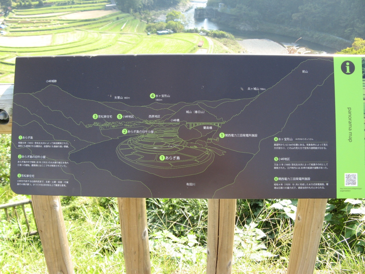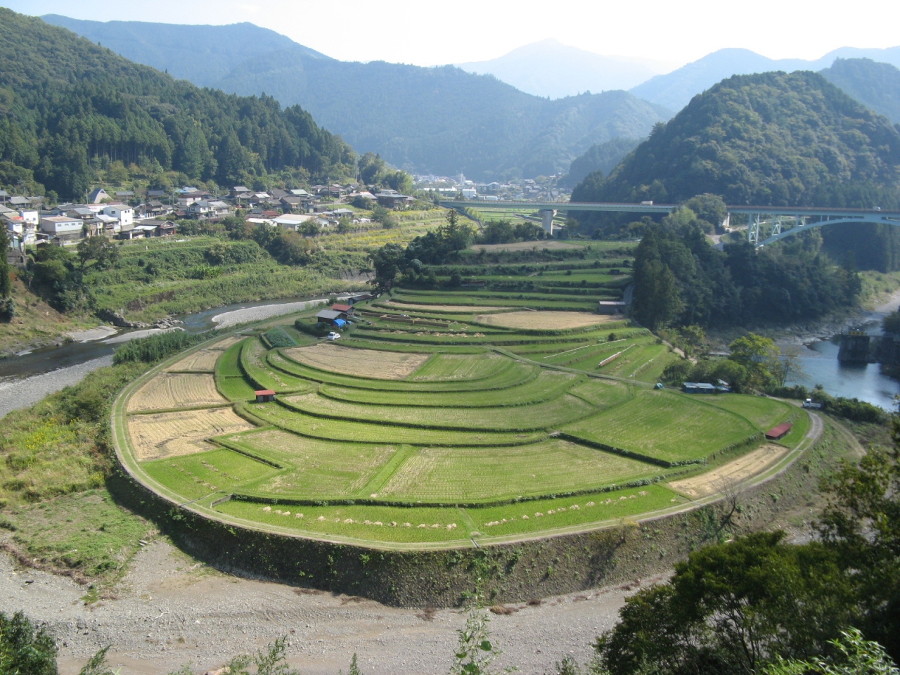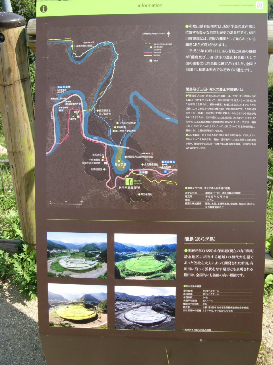 “道の駅あらぎ”から、県道19号線を東に車で走って2分足らずのところに展望所があって、あらぎ島の棚田を見ることができます。曲がりくねった有田川に囲まれた丸い形をした田んぼです。訪れたのが10月初旬で刈り入れが終わっていたのが残念でしたが、なかなか面白い風景を見ることができました。9月上旬、黄金色に輝くであろう刈入れ前にもう一度写真を撮りに行きたいと思いました。