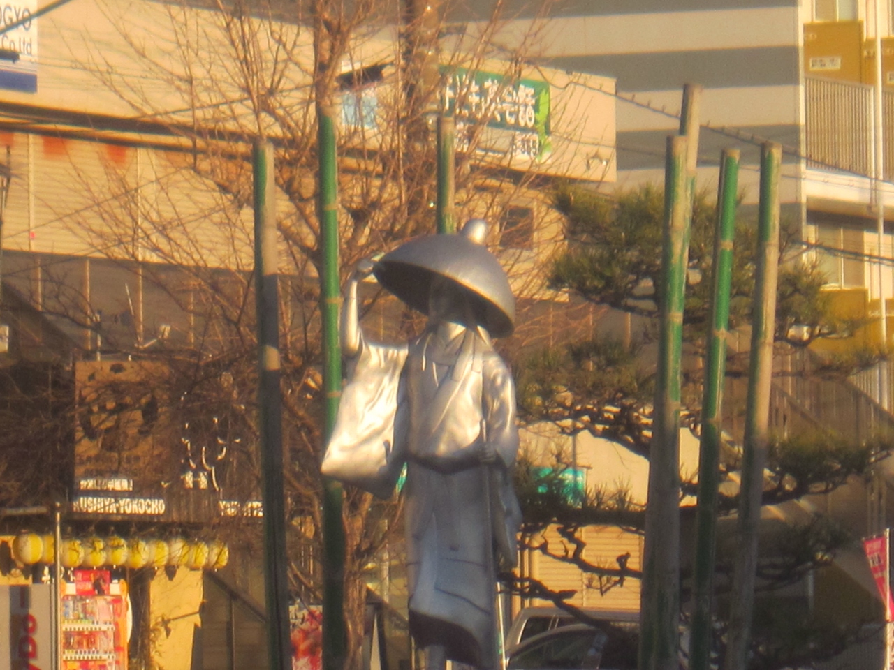 五井駅東口からまっすぐ伸びる駅前の通り。駅前からすぐのところの中央分離帯に何やら銅像があった。横断歩道などがあるわけでもなく、交通ルールを守っている限りは近くに寄ることはできない場所にあり、誰の銅像なのかわかりにくい。この女性の像は菅原孝標女(更級日記の作者)の銅像らしい。平安時代に市原に上総国府があったときに父親である菅原孝標が赴任し同行、その帰路の孝標女をモチーフとしているそう。そんなことで、この通りの名前は「更級通り」というようです。説明らしきものも周囲に見当たらず、特に気に留めている人も周囲には見当たりませんでした。
