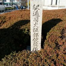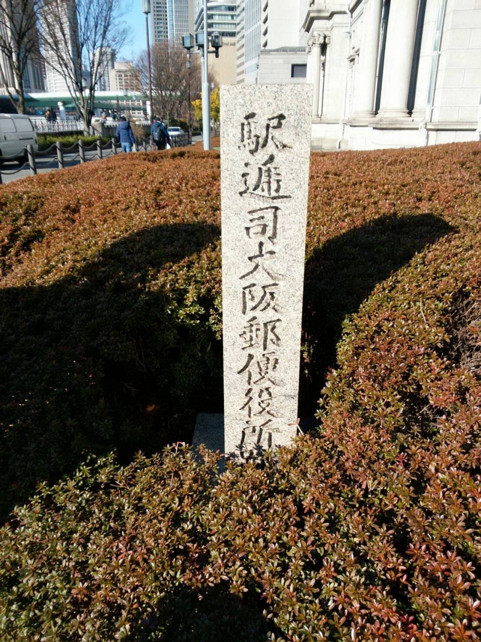 淀屋橋のたもと(北側)にあるに日本銀行大阪支店の脇の植込みに石碑がありました。明治時代、日本初の郵便制度が導入されたときに郵便役所がこの地に置かれたそうです。現在は、当時の面影は全くありませんが、石碑の脇には金色の郵便ポストがあり、現在も使われていました。淀屋橋周辺を散策した際は、立ち寄ってみるのもオススメです。