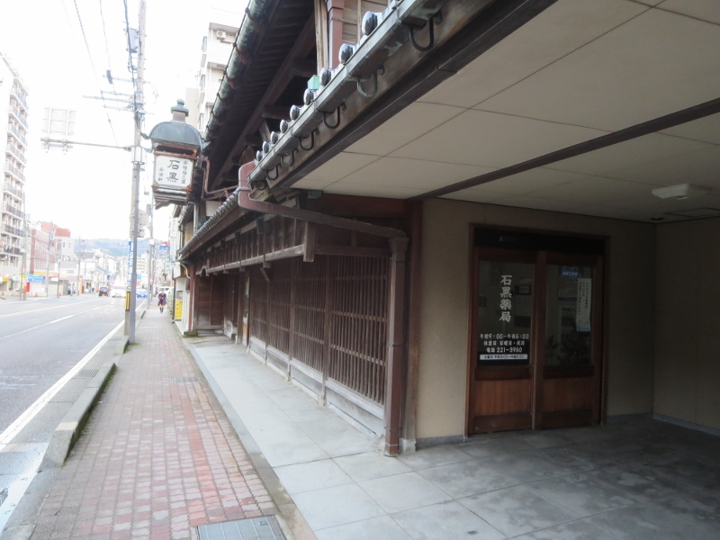尾張町の通りには古い建物が何軒か並んでいました。その中の1軒が由緒のある商店ながら、今も伝統を引き継いて現役の薬局として営業している石黒薬局でした。建物を見ると立派な伝統的建造物ですが、「処方箋受け付けます」のポスターが貼ってあるので、現役の薬局であるのを確認しました。
