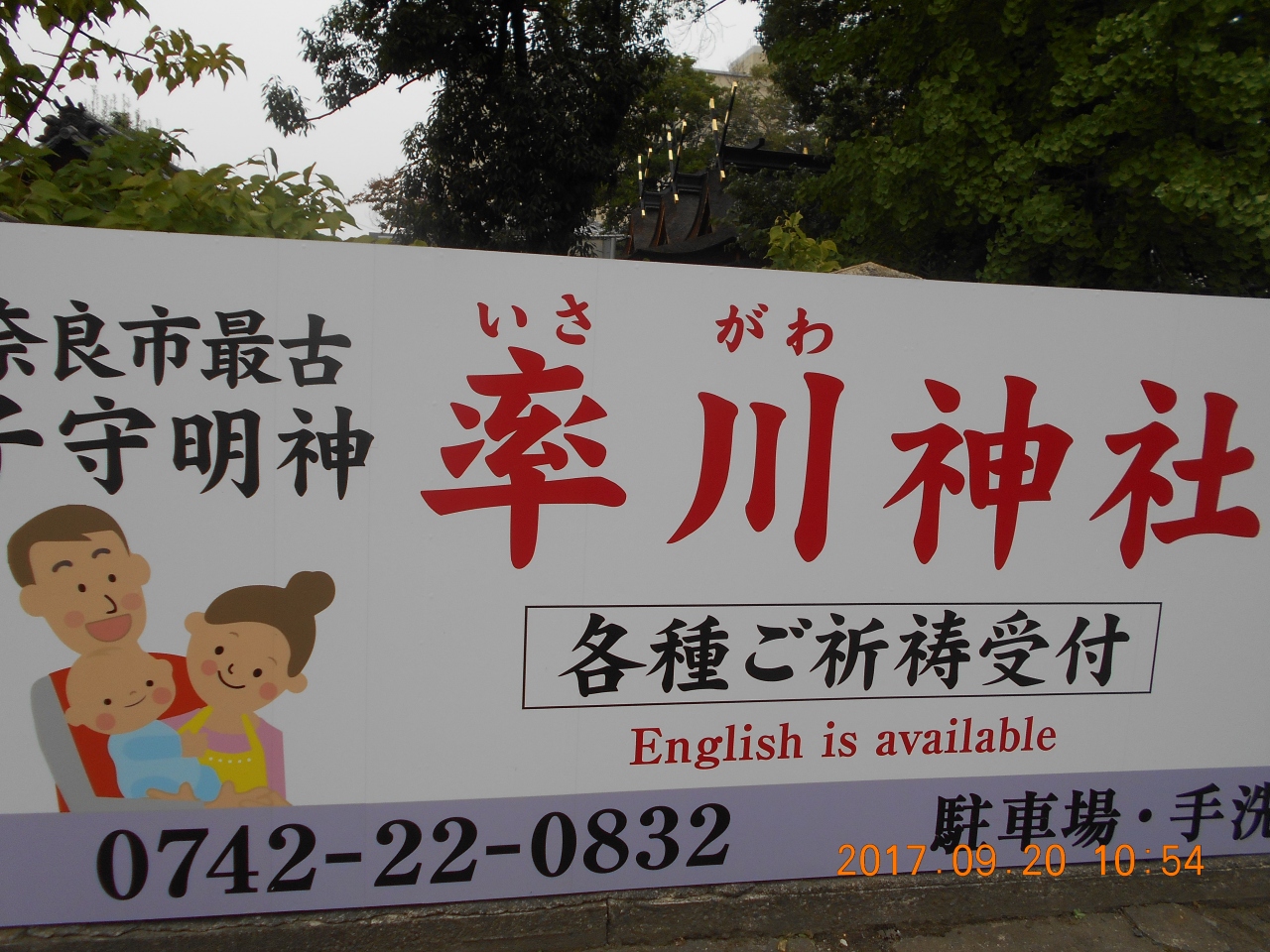 近鉄奈良駅のほうからやすらぎの道に沿って歩いていくと 三条通を過ぎた右側にあるとても広い神社です。やすらぎの道からよく見えるように大きな看板が出ていてフリガナがついていたので「いさがわ」と読むのだとわかりました しめ縄の下がった門とその向こうにある赤い鳥居を通って境内に入り、参拝するようになっていました。