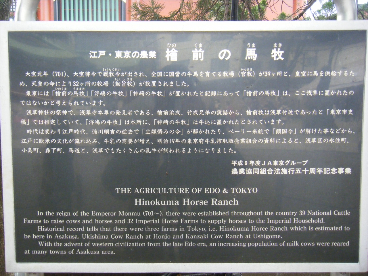 浅草寺内の浅草神社の鳥居をくぐると、たくさんの史跡や石碑が並んでいますが、そのうちの一つがこの「檜前の馬牧」になります。馬牧と言われても何の事だかさっぱりわかりませんでしたが、案内板によりますと大宝律令によって厩牧令が出され、全国に国営の牛馬を育てる牧場(官牧)と、皇室に馬を供給するための牧場(勅旨牧)が設置されたそうです。ここ浅草には「檜前の馬牧」が設置されていたと考えられているようです。昔小学生か中学生の頃に習った大宝律令をここでまた目にするとは思ってもいませんでした。良い勉強になりました。