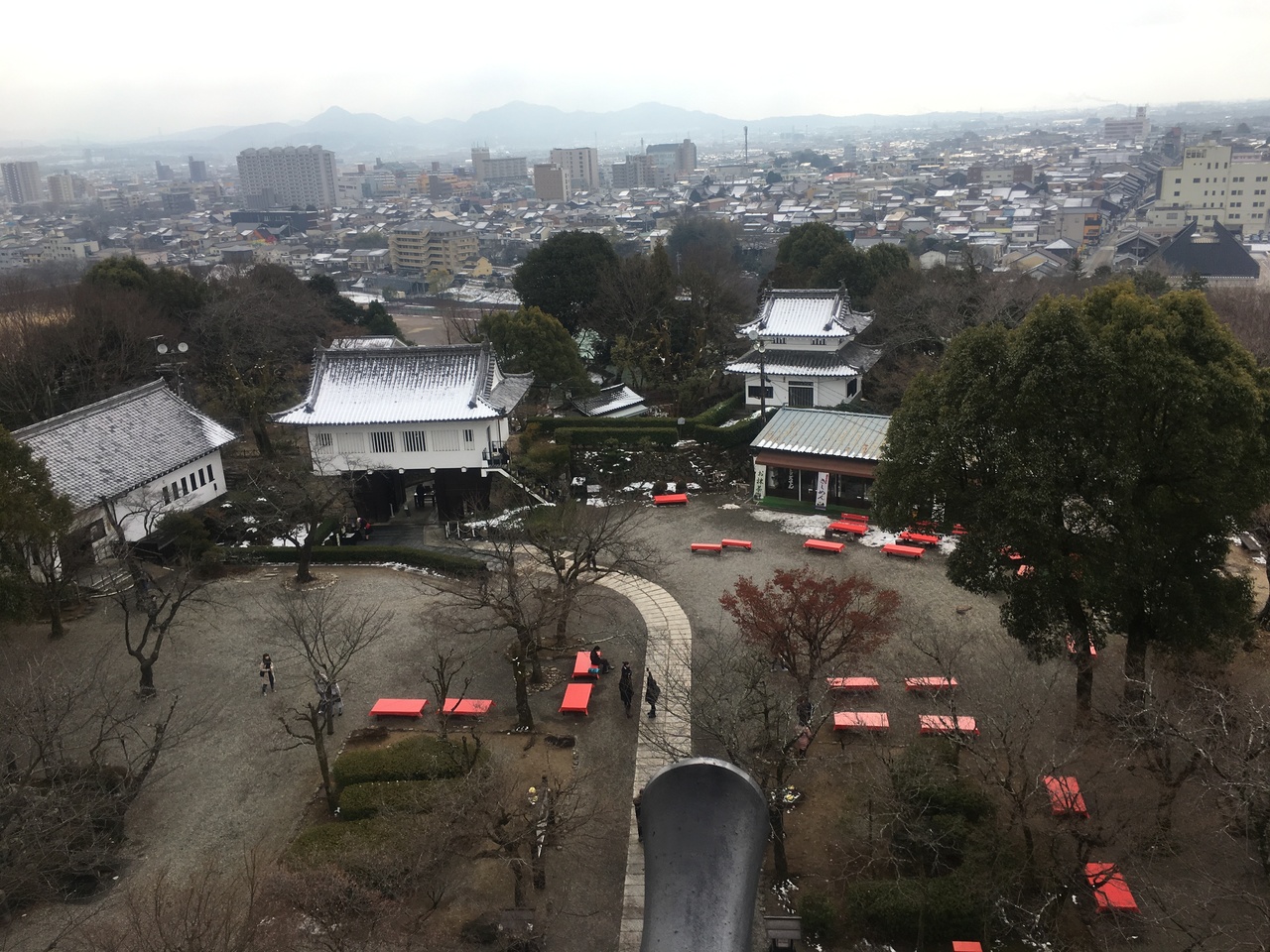 風が吹いて寒い!でも、そこからの眺めは最高でした。ただ、床面はやや傾いていて、遮るものも無いので、他の天守閣よりはちょっと怖いです。