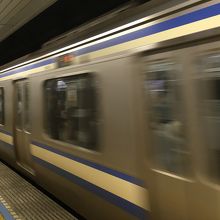 千葉県から東京に行く電車ですが、同じ総武線といっても、黄色い電車は各駅停車、ブルーのラインの電車は快速運転となっていて行き先なども全く違うので、別の路線と思っていいと思います。乗り換えも同一ホームでは出来ないので、あまり便利ではありません。朝夕は混雑します。大きな荷物を持っている場合はこの時間は乗りにくいと思います。
