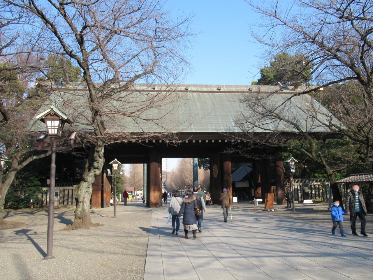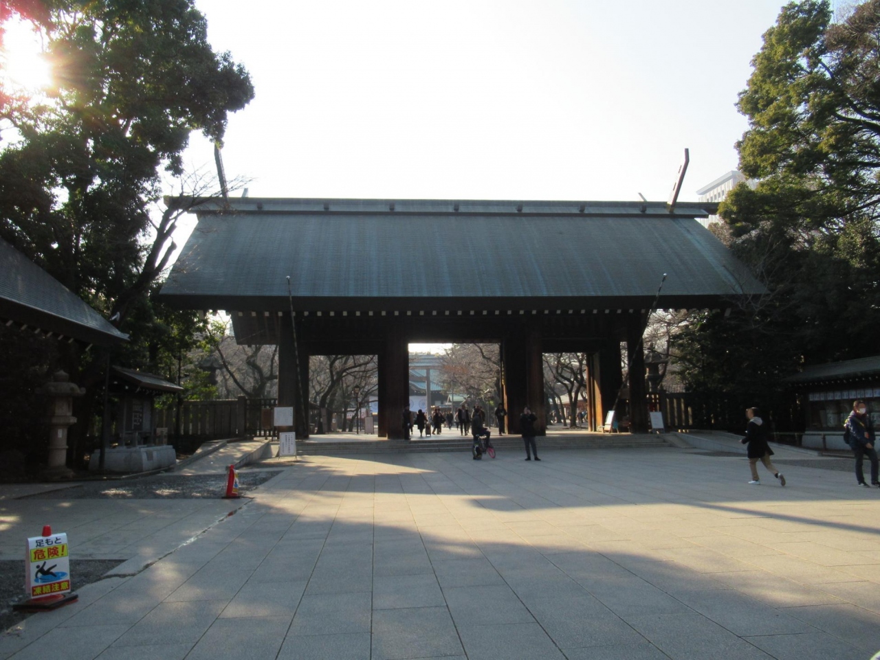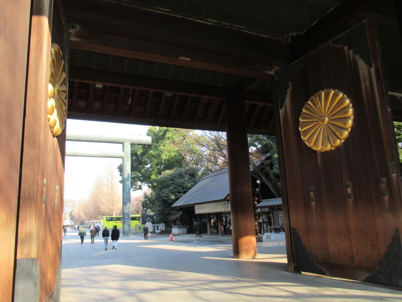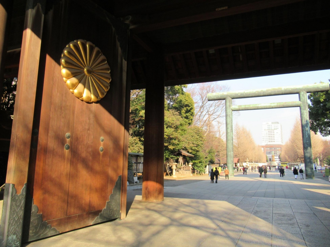 靖国神社を訪ねた折などには、ここ神門の金色の大きな菊花の御紋章も忘れずにご覧になることをお勧めします。