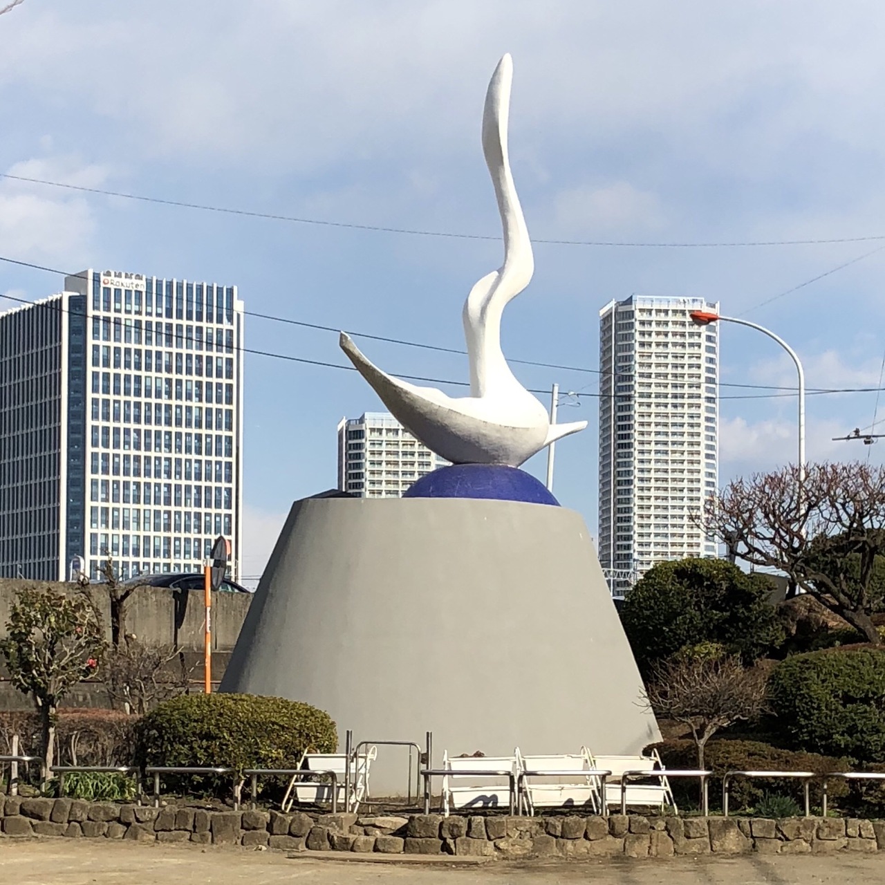 「芸術は爆発だ!」でおなじみの岡本太郎が作成した、青と白の独特なデザインの碑です。