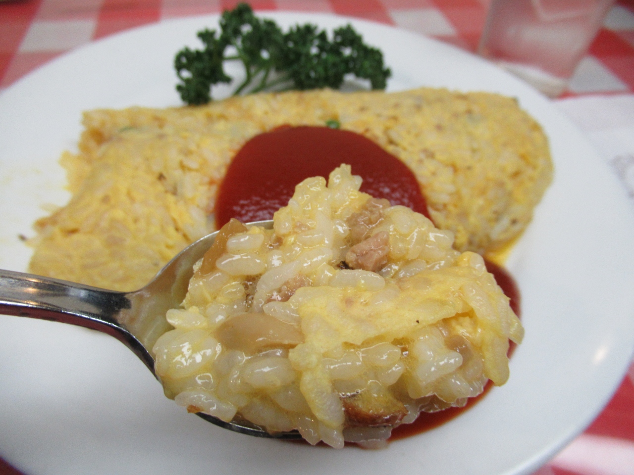 オムライスはトロトロたまごがケチャップライスの上ではじけるモノだとの固定概念を覆す「玉子混ぜしっとりチャーハン」のような感じでした。