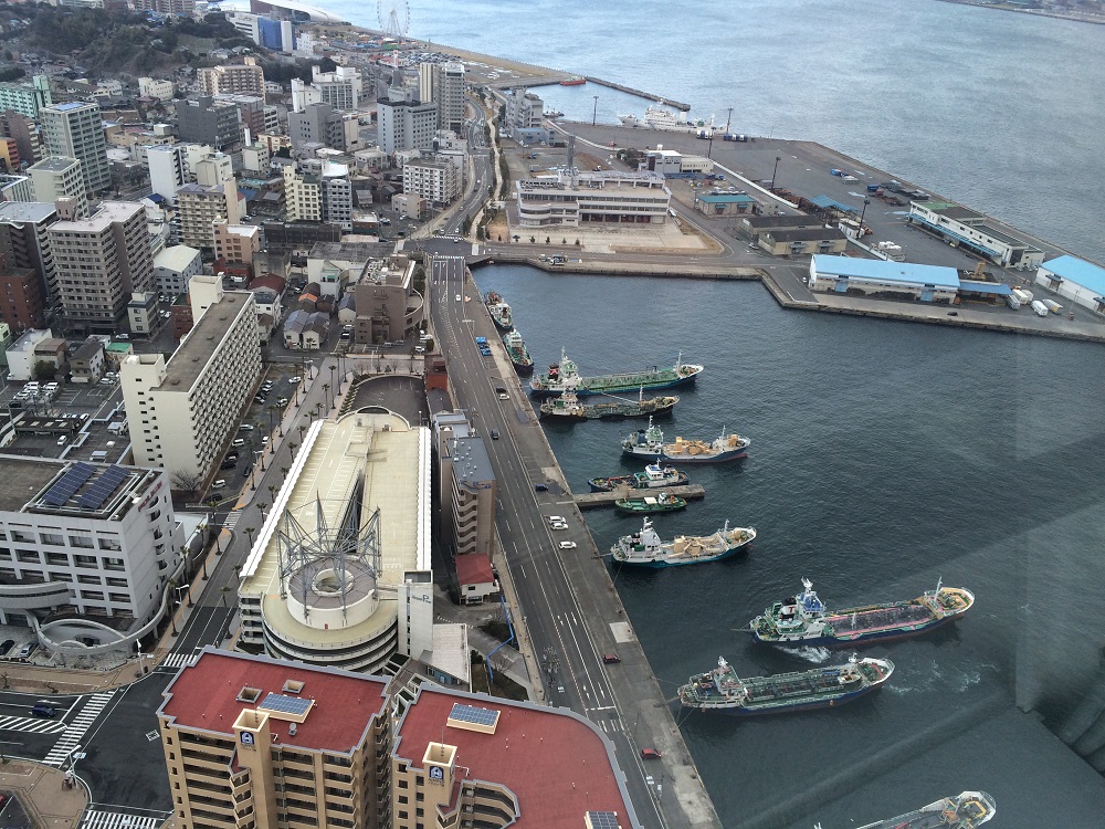 関門海峡をすぐ近くから見下ろせて、行き交う船や停泊している大きな船なども見えました。門司や小倉の方も見渡せました。