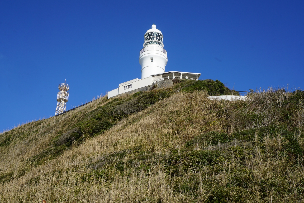 御前埼灯台は、太平洋に向かって建つ白亜の灯台。高さは22mあまりですが、崖の上に建つので、海岸の方から見上げるとその姿はけっこう雄大。周囲には遊歩道もあちこちに延びていて、要所要所から違う角度で眺めれるのも楽しいと思います。