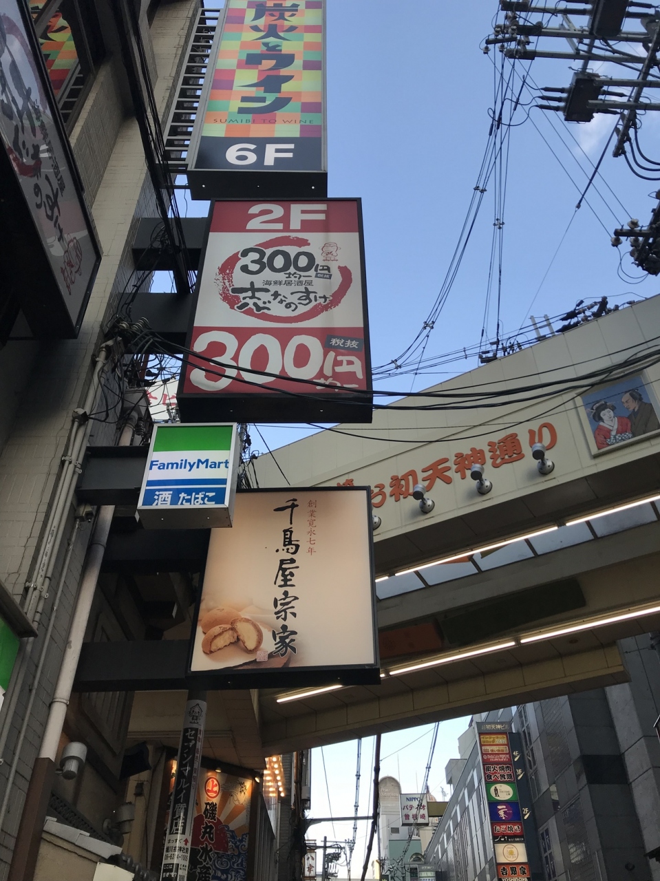 大阪駅の近くにある商店街です。大阪駅周辺の近代的な建物の並ぶ雰囲気とは違って、こちらは昭和な下町の雰囲気です。飲食店をはじめとしてたくさんの大阪らしく、とても活気に溢れています。歩くだけで楽しくなります。