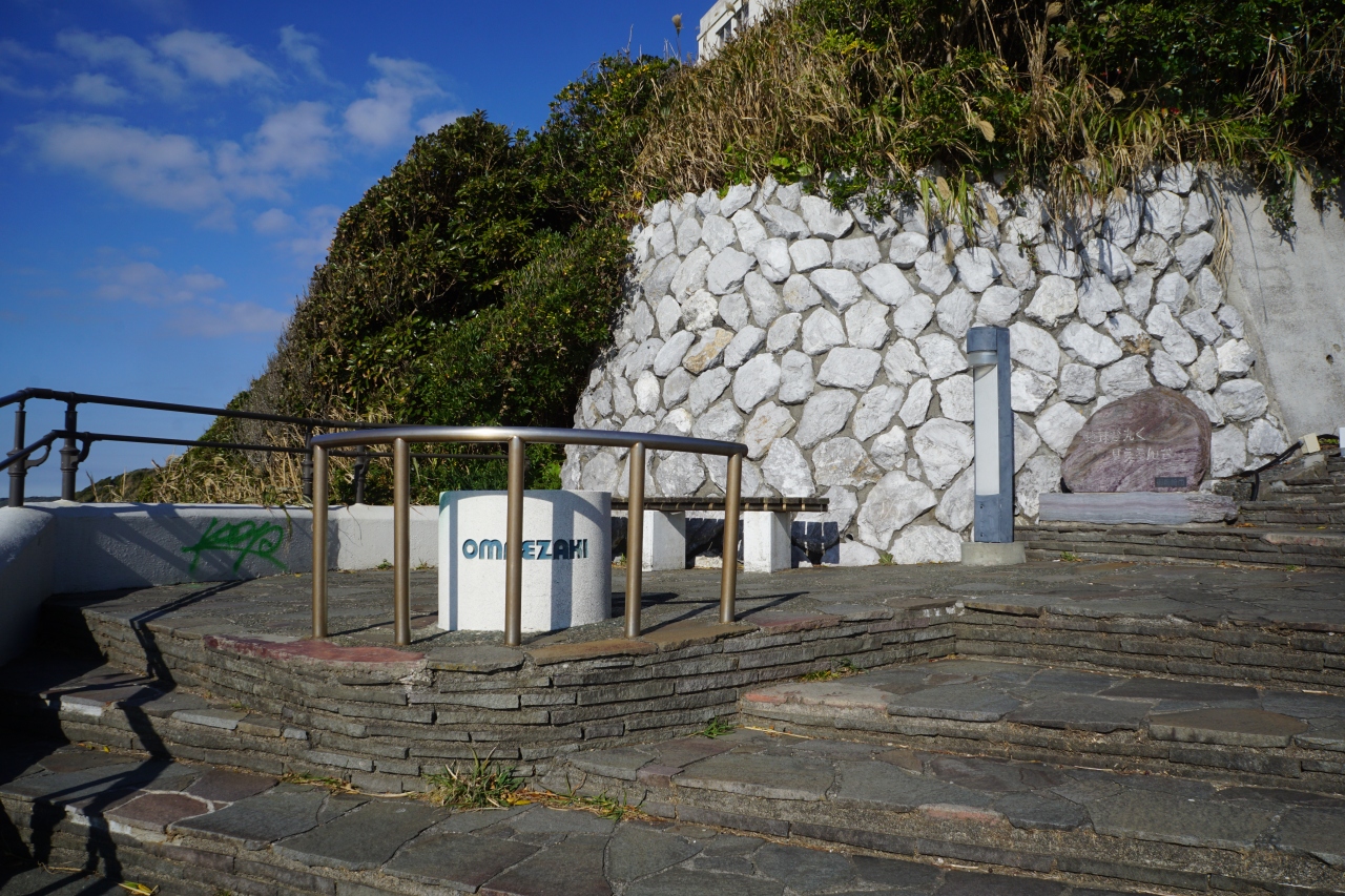 地球が丸く見えるん台は、御前埼灯台から海岸に降りていく階段の途中にある展望所。灯台の足元みたいな場所です。