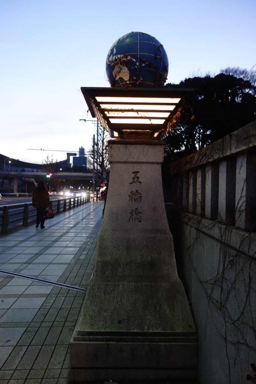 表参道から原宿駅付近のJR線線路を渡って代々木公園方向へ抜けていく道にかかる橋です。五輪橋と彫られた橋のサインと青い地球儀のオブジェが目立ちます。この橋でJR線を渡るとその先に代々木体育館が見えてきます。