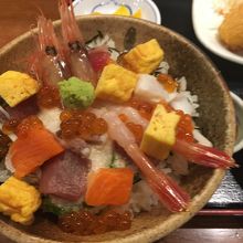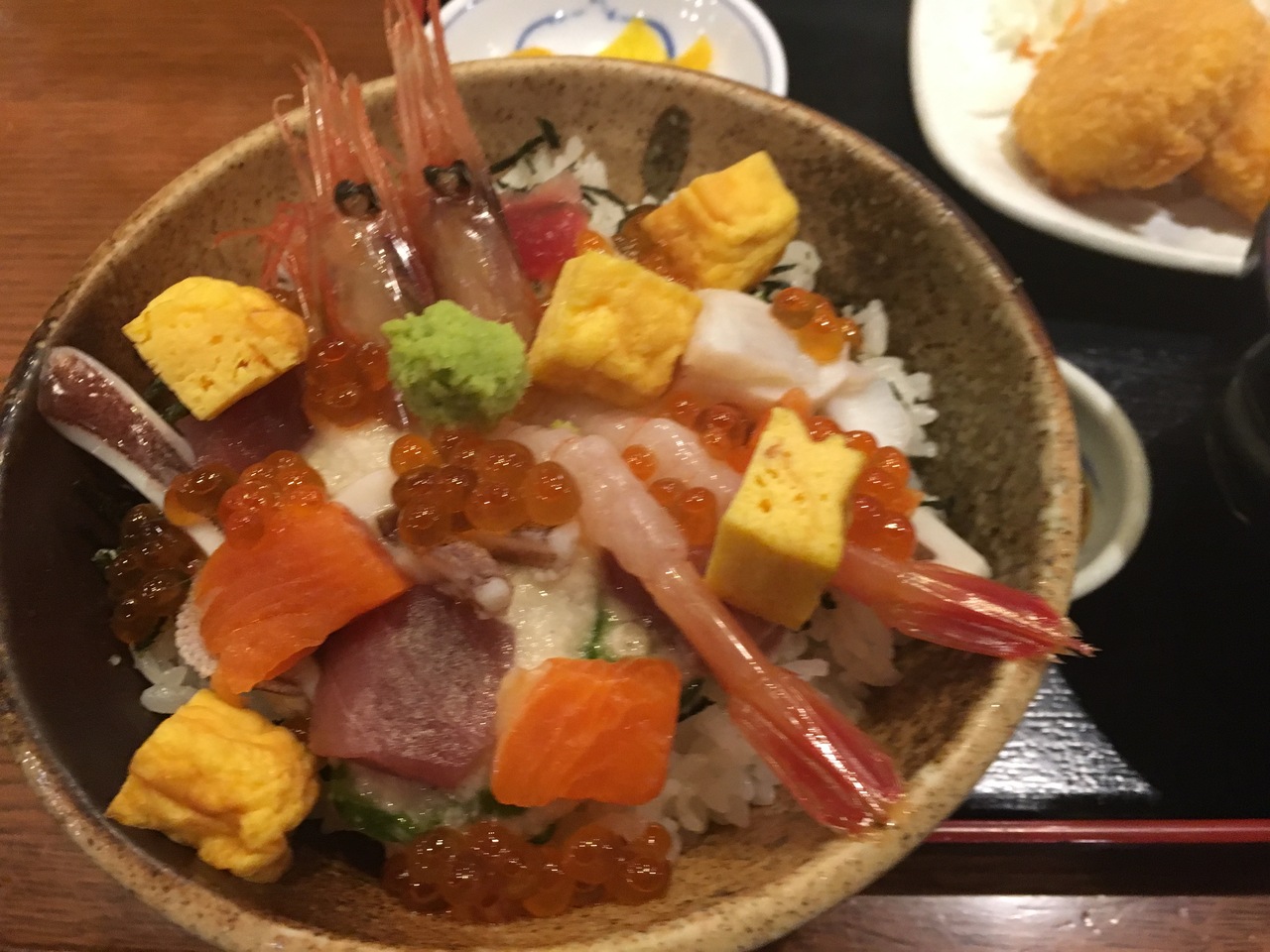 ランチとしてやすい方ではないですが、1000円ほどで海鮮丼というかばらちらしのような丼ものが食べれました。海鮮丼としてはお手軽で入りやすいお店があってよかったです。海鮮丼のほかにも焼き魚などももちろんあります。一緒についてきたコロッケも美味しくて満足です。